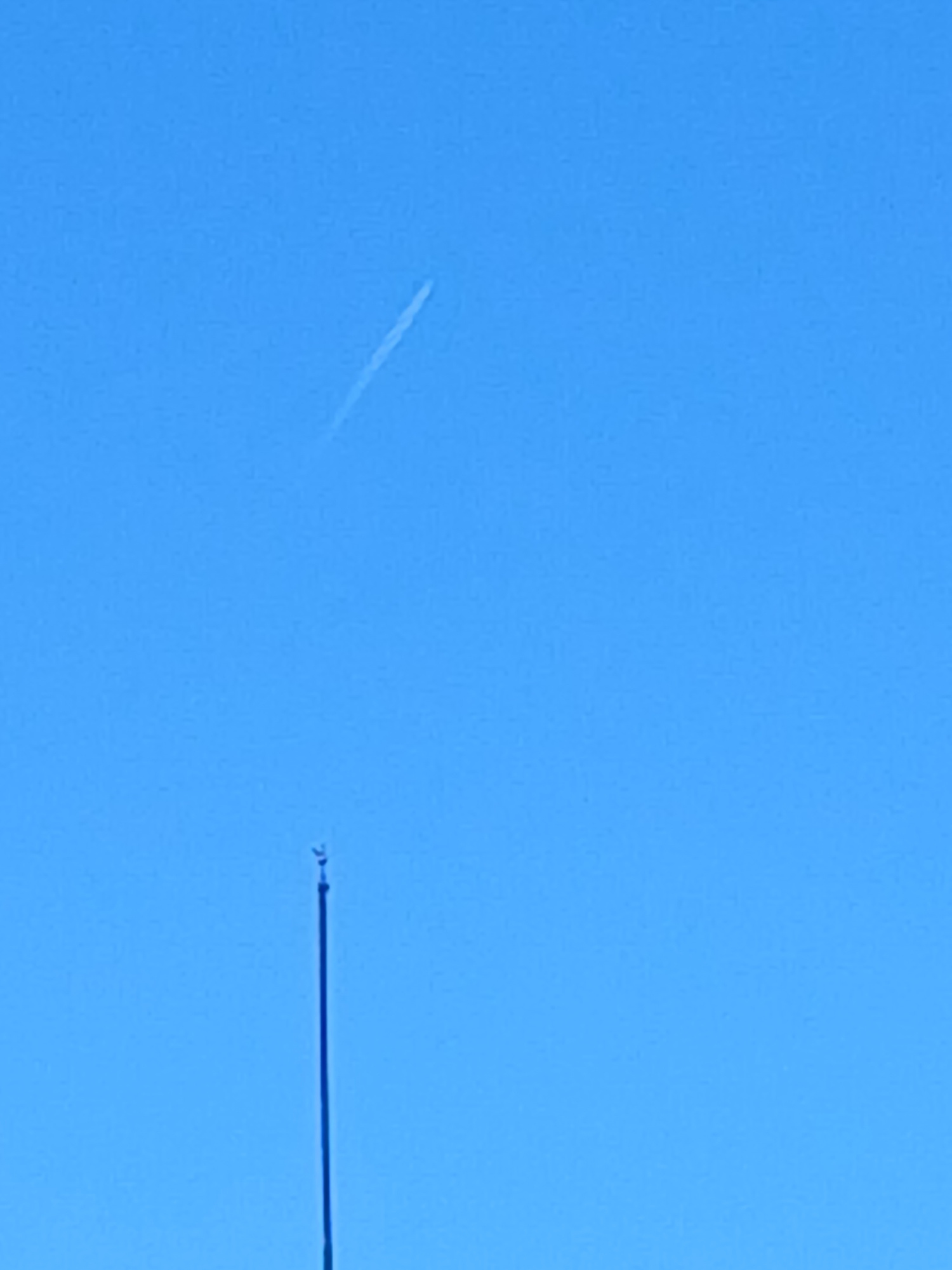 The image shows a bright blue sky. A faint contrail is visible in the distance towards the left side of the frame. A thin, dark horizontal line, likely a wire, is present on the right side of the imag…read more