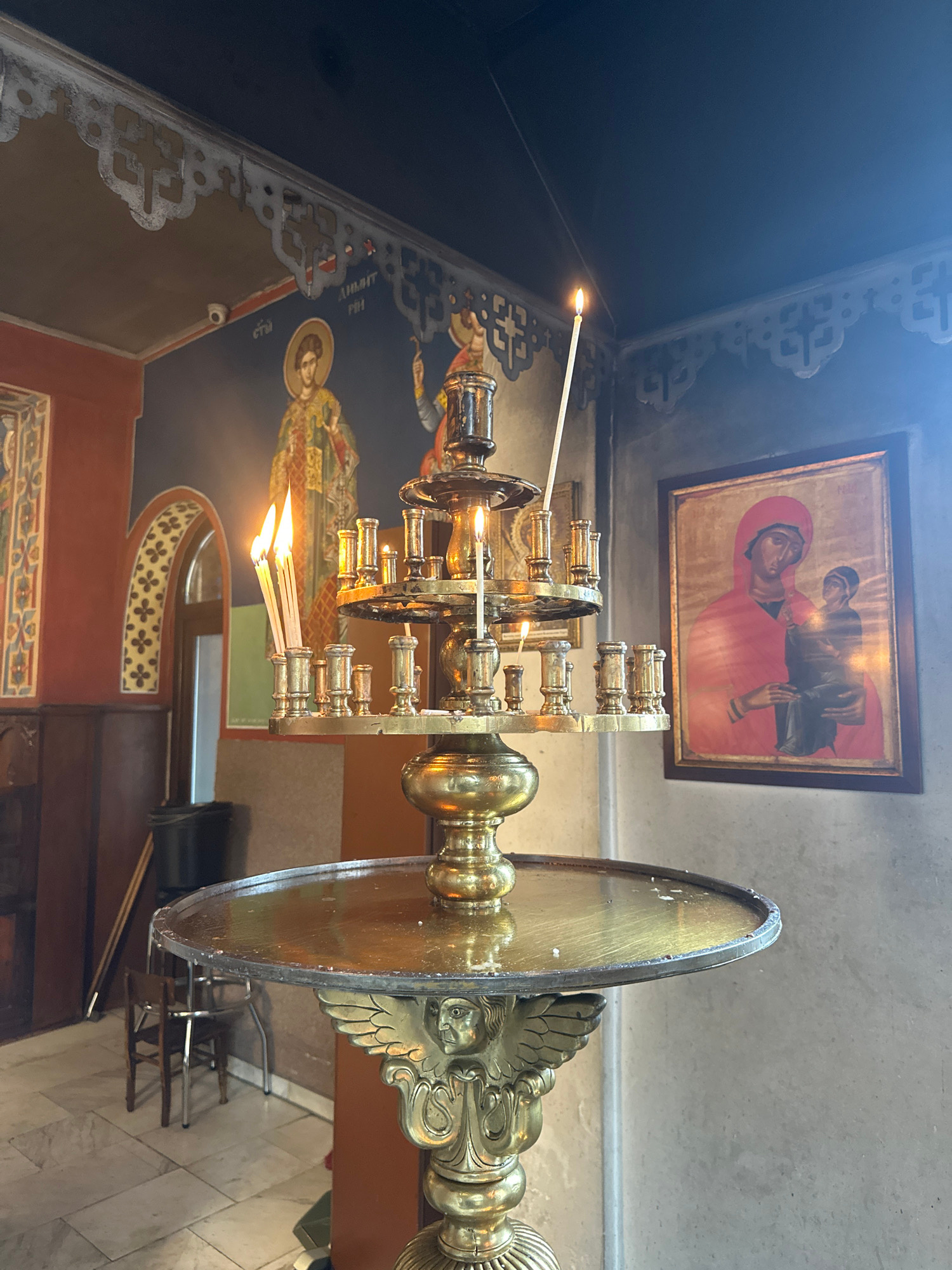 The image captures the interior of an Eastern Orthodox church or monastery, likely in Sofia, Bulgaria, characterized by rich religious iconography and warm lighting. In the foreground stands a magnif…read more