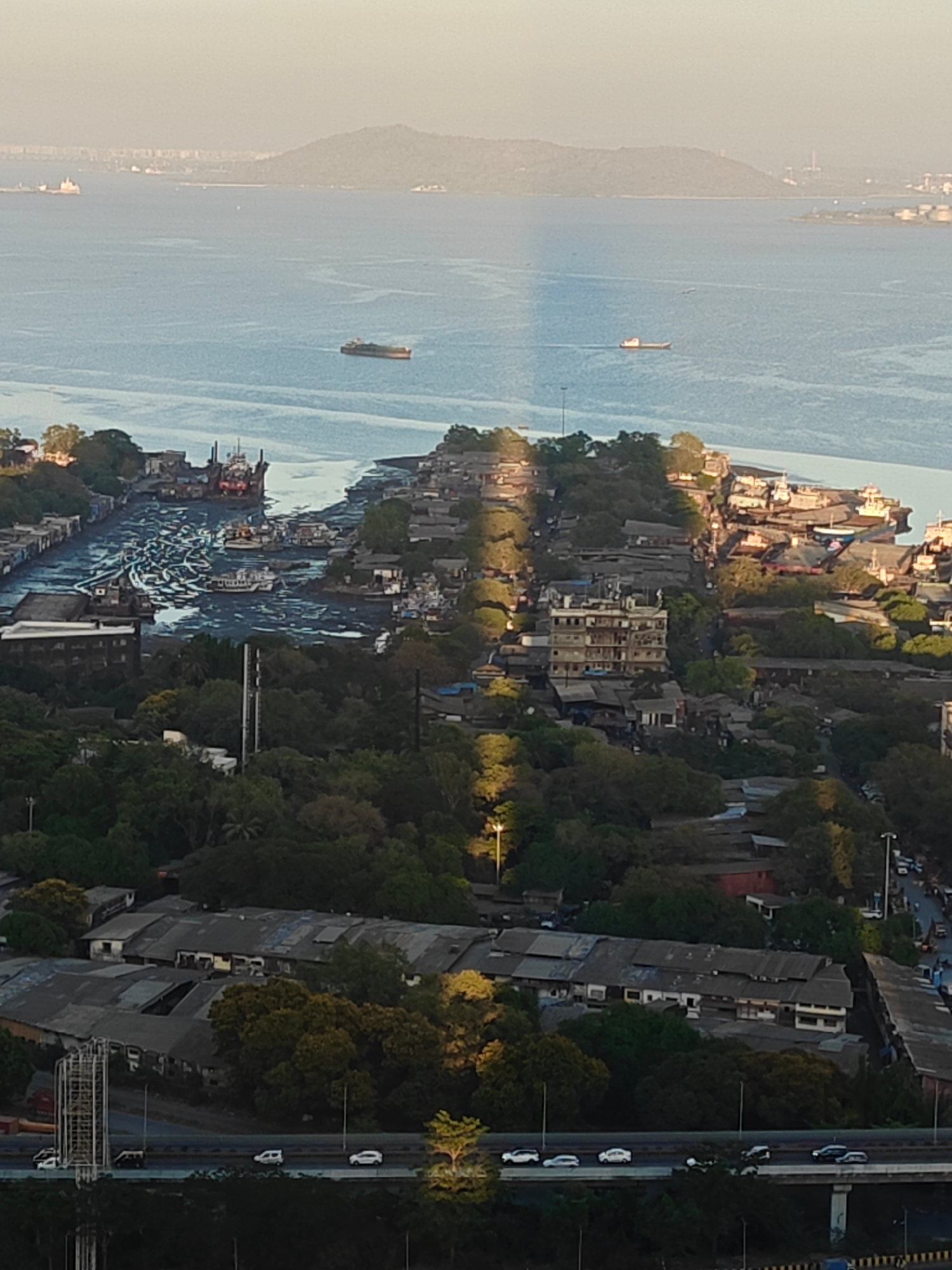 This is an aerial or high-angle view capturing a vibrant coastal urban landscape in Mumbai, India, likely during the golden hour of either early morning or late afternoon, as indicated by the long, prβ¦read more