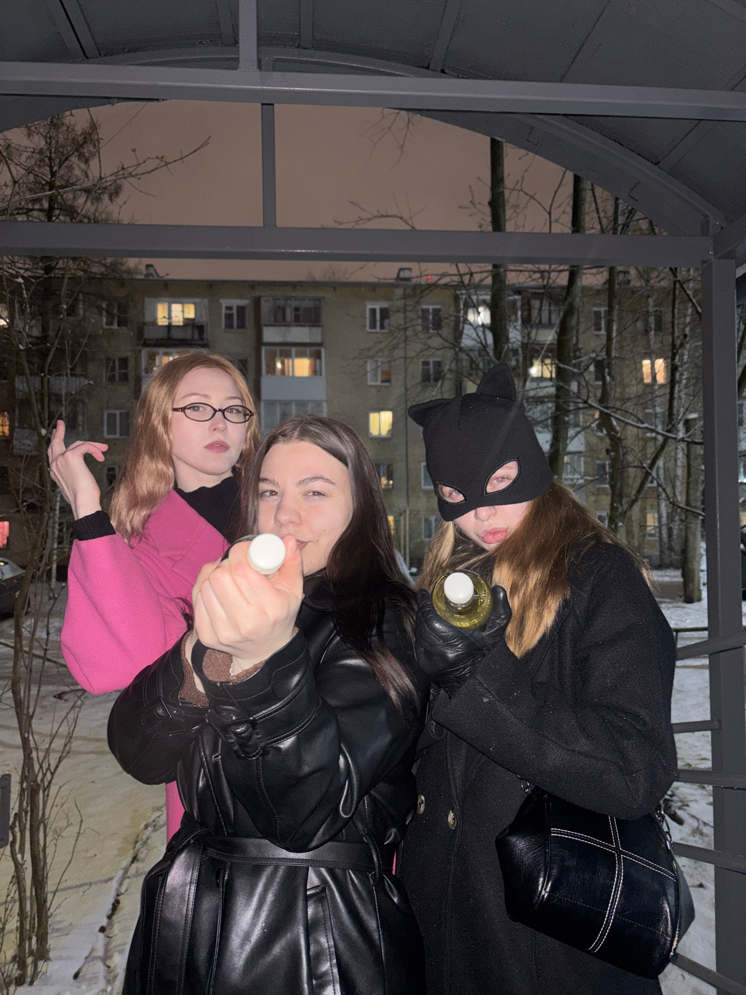 Three young women are posing for a photo outdoors at night, likely in a cold, snowy urban setting in Perm, Russia. They are positioned under a grey metal structure, possibly a balcony or shelter. On…read more