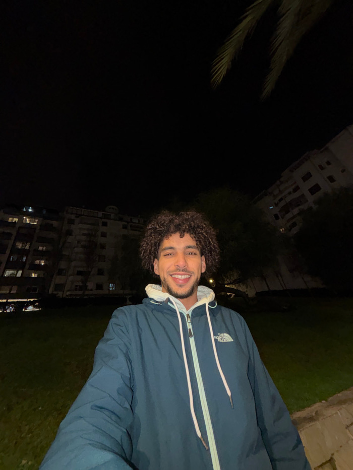 The media file displays a young man captured in a nighttime outdoor setting. He is positioned towards the right side of the frame, smiling broadly and looking directly at the camera. The man has dark,…read more