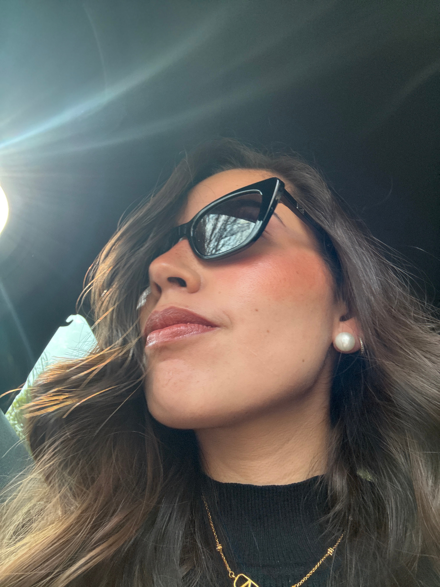 A woman with long brown hair, wearing black cat-eye sunglasses, a black turtleneck sweater, and a gold necklace with a V-shaped pendant is positioned at an angle in what appears to be a car interior.…read more