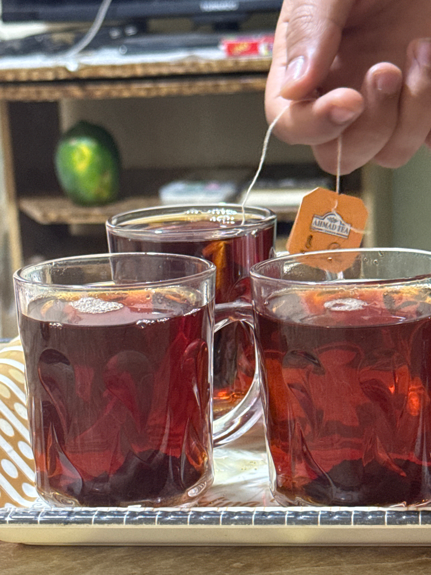 A hand holds the string of an Ahmad Tea teabag, with three clear glass cups filled with a dark red liquid, possibly tea, arranged on a tray. A lime is visible in the background. The specific location…read more