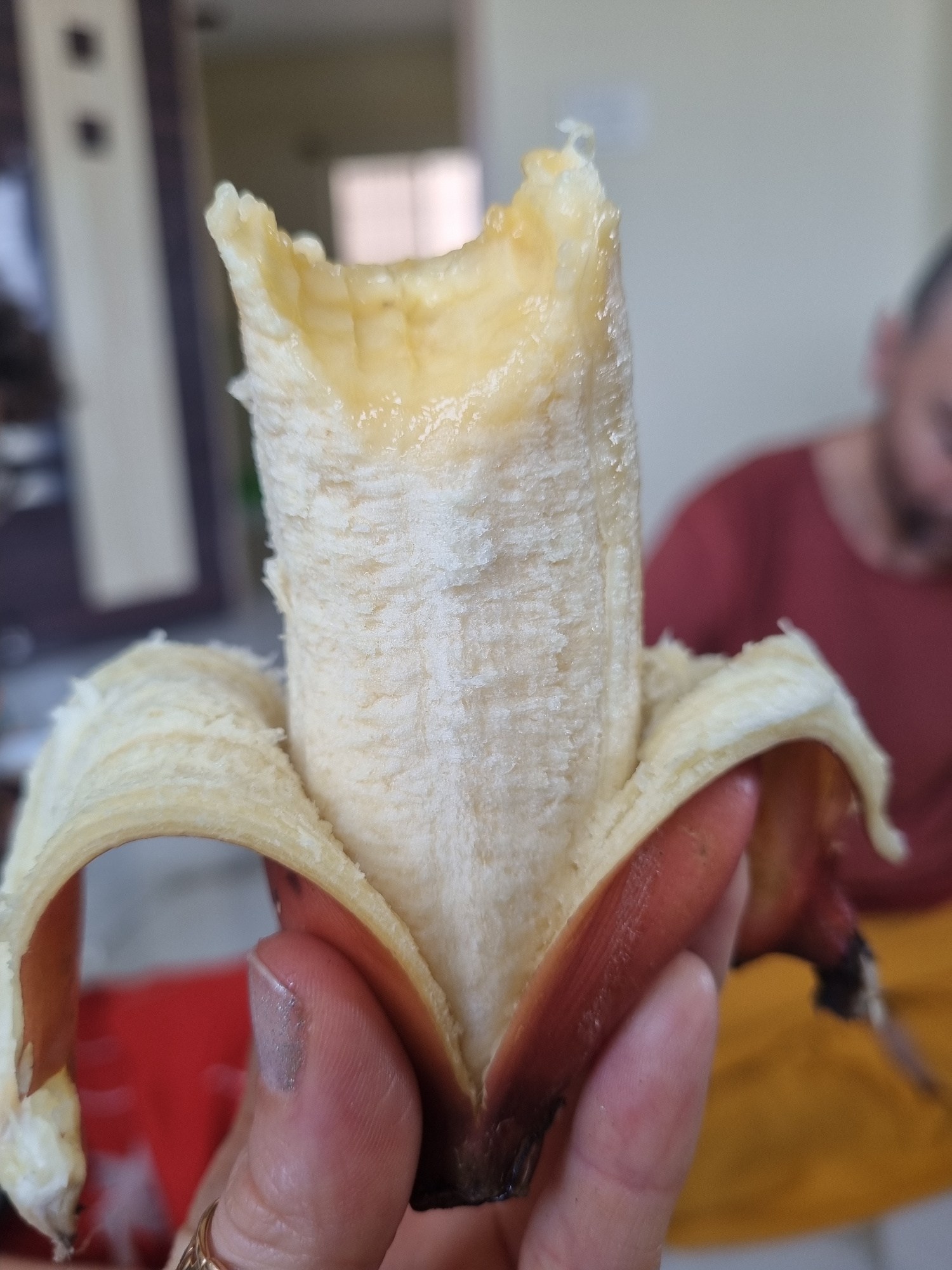 A partially peeled red banana is held in someone's hand. The banana peel is a reddish-brown color. The fruit inside is yellow and creamy. A person is partially visible in the background, wearing a mar…read more