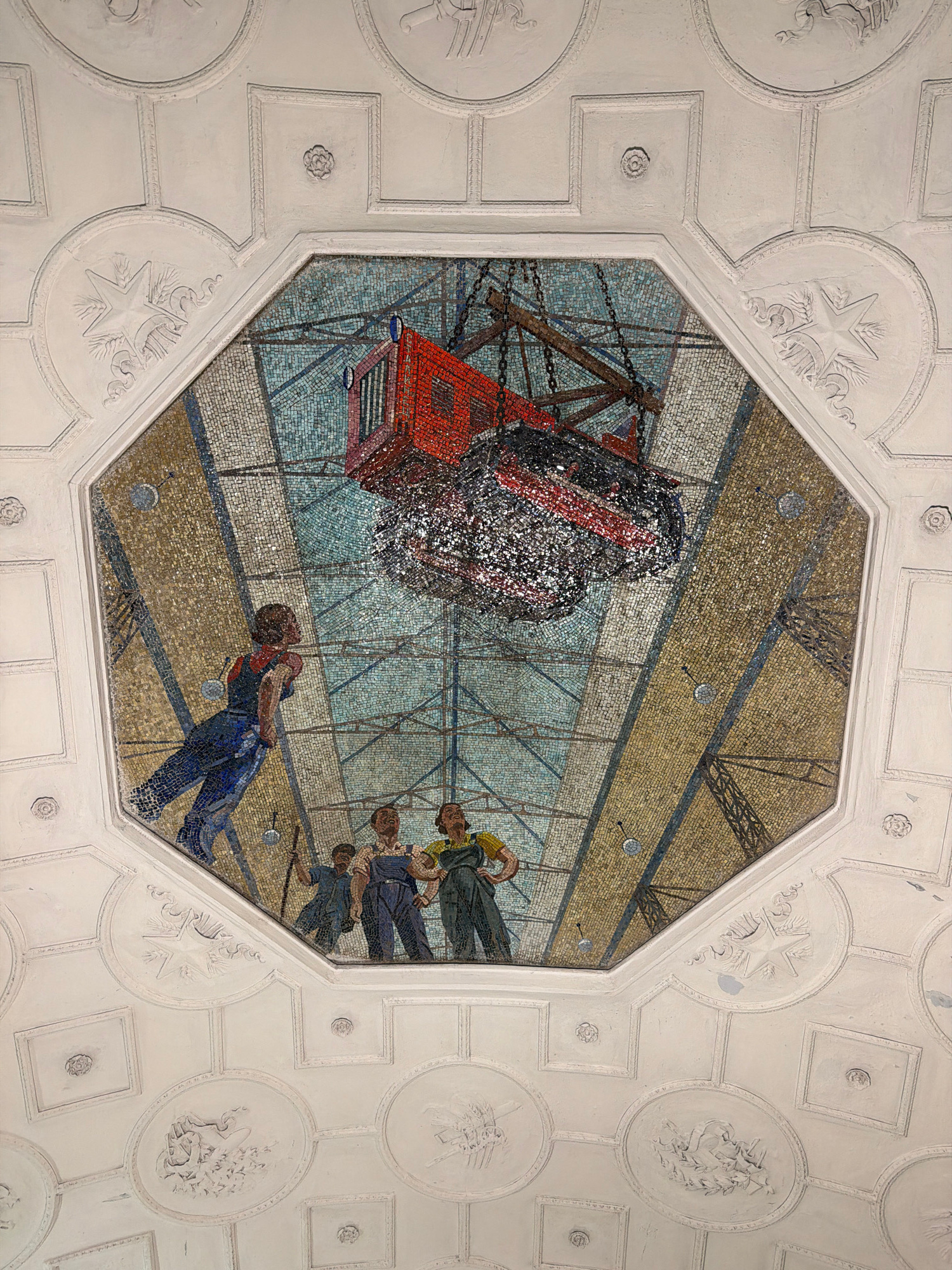 This media file captures an octagonal ceiling mosaic depicting an industrial scene, framed by ornate white plasterwork. The mosaic shows several male figures engaged in heavy labor within what appear…read more