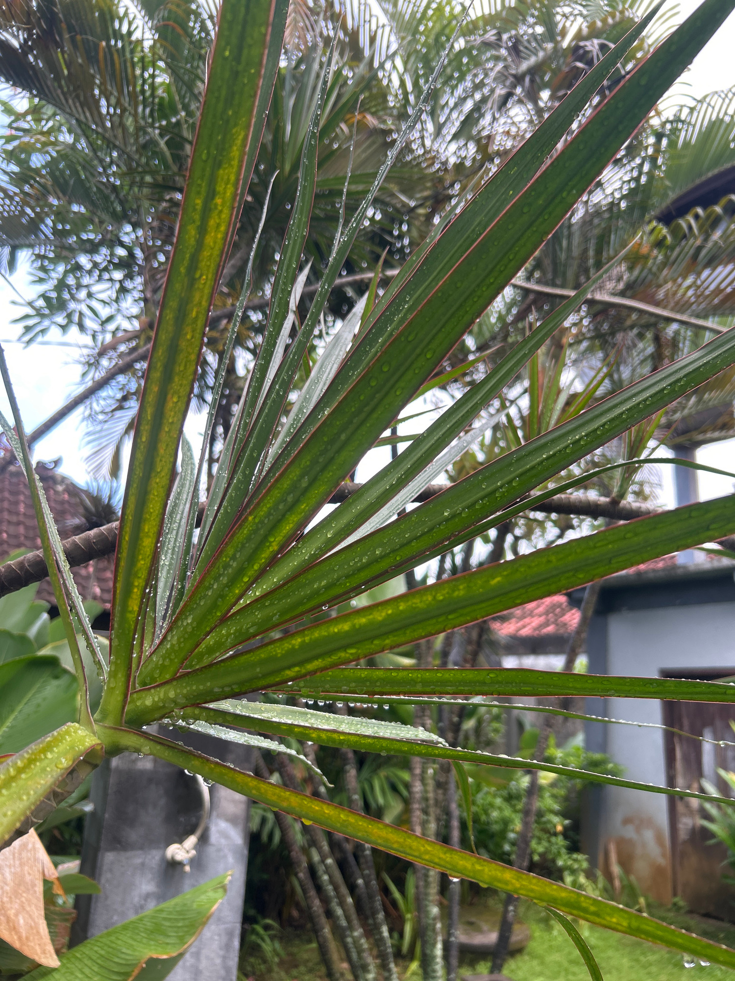 This close-up shot features the vibrant green leaves of a plant, likely a species of Dracaena or Cordyline, prominently in the foreground. The long, slender leaves are a deep green with distinct reddi…read more