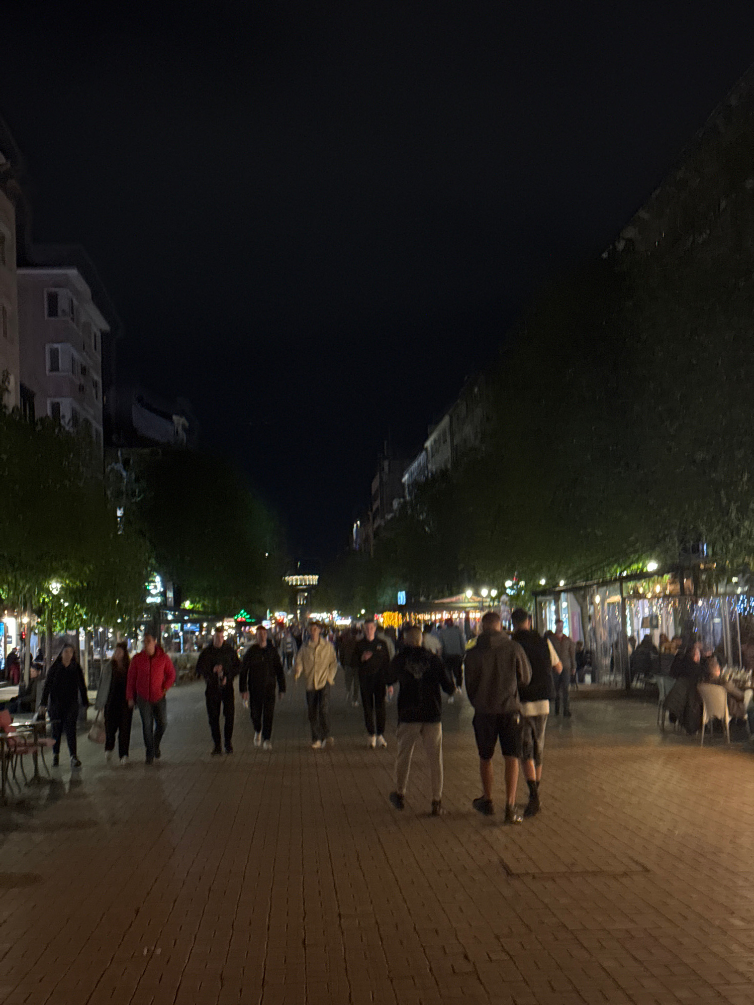 The image depicts a lively nighttime scene along a waterfront promenade, likely a river or canal in Sofia, Bulgaria. The left side of the frame features the dark, calm water of the waterway, with fain…read more
