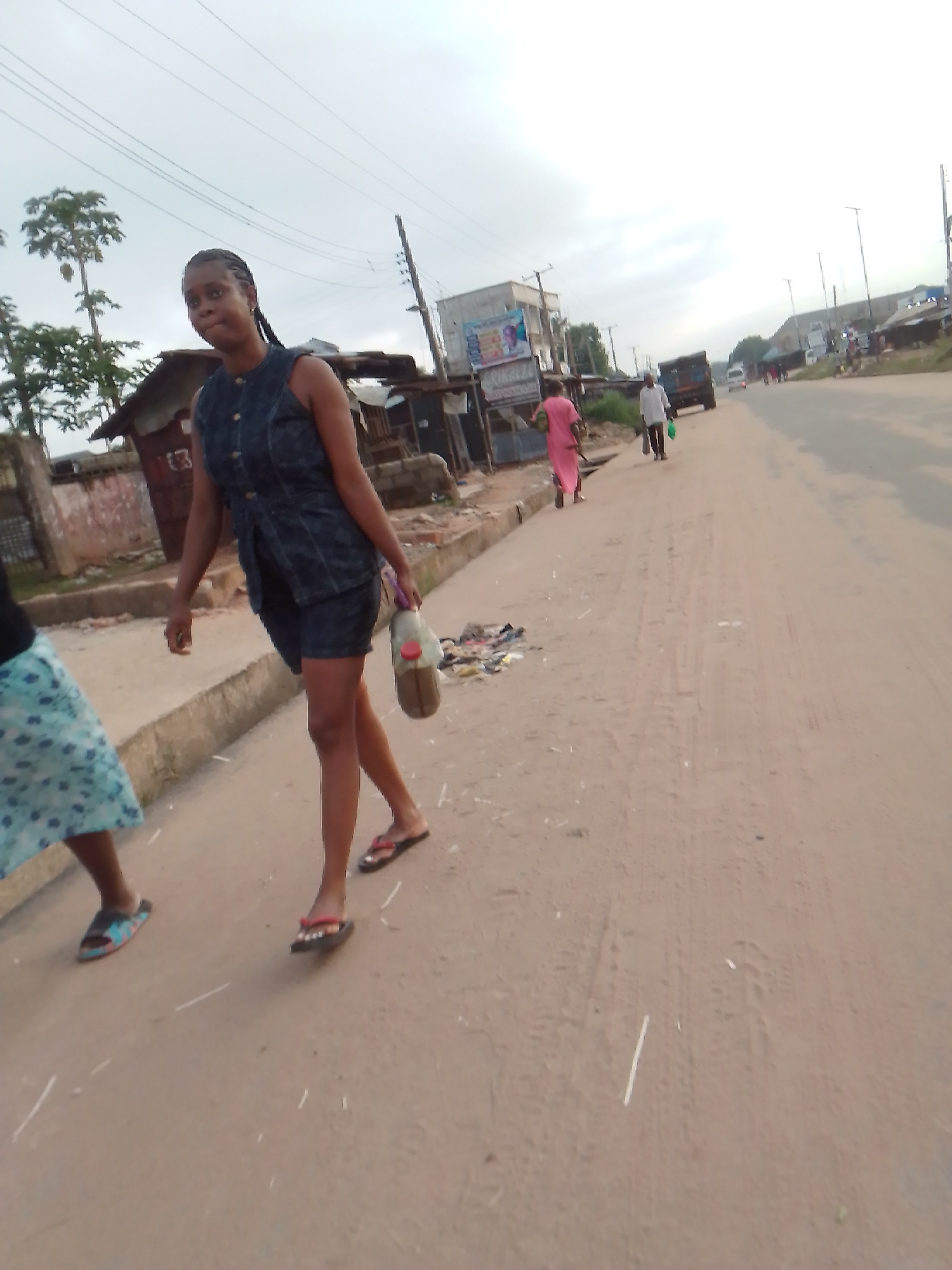 The image shows a street scene in Owerri, Nigeria. A woman in a dark denim vest and shorts is walking on the shoulder of a paved road, carrying a clear plastic bottle with a red cap containing a dark…read more