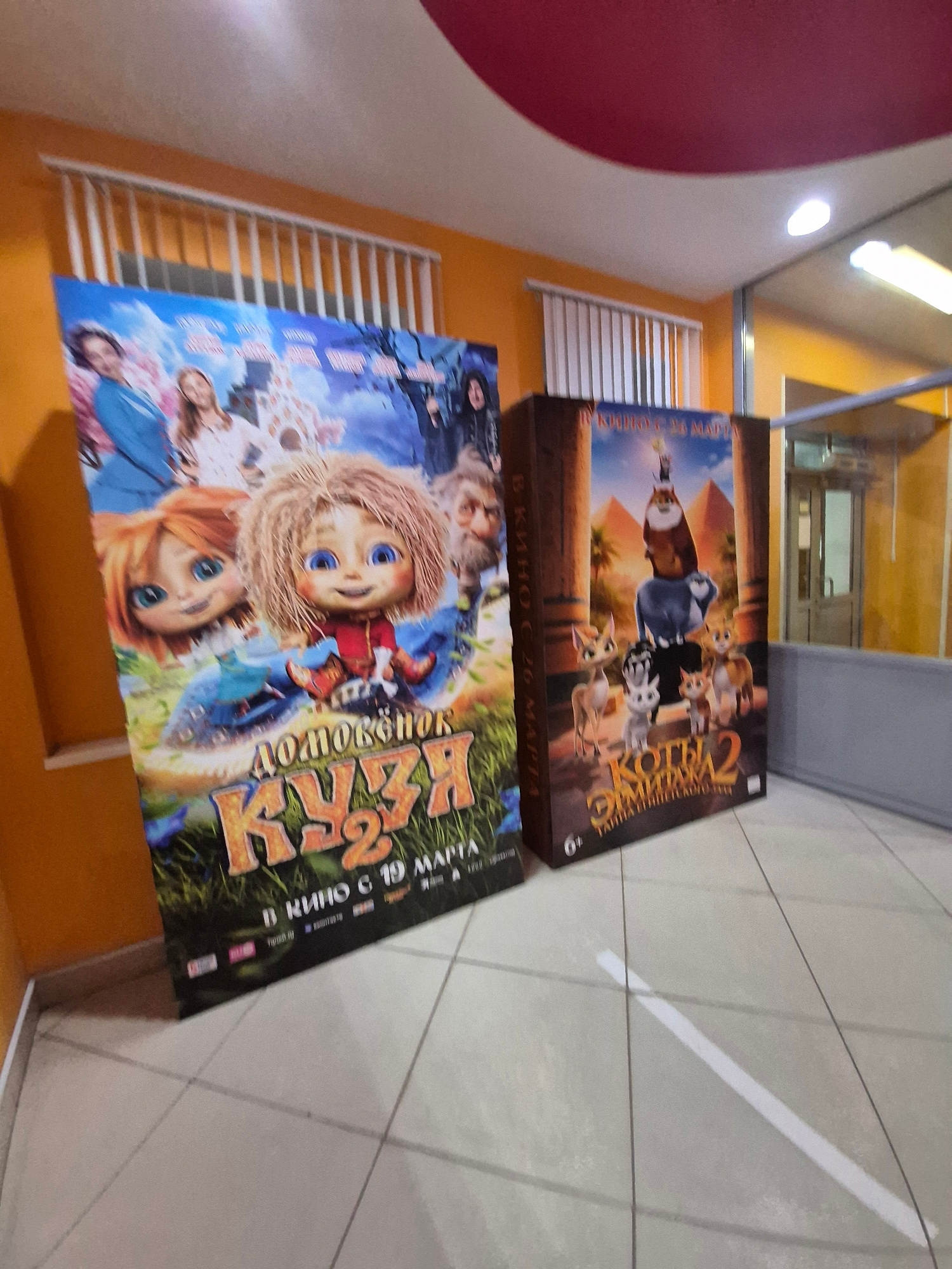 The image depicts two movie posters placed on a tiled floor in what appears to be an interior space, possibly a lobby or entrance area. The location is suggested to be in the city of Chaikovsky, Russi…read more