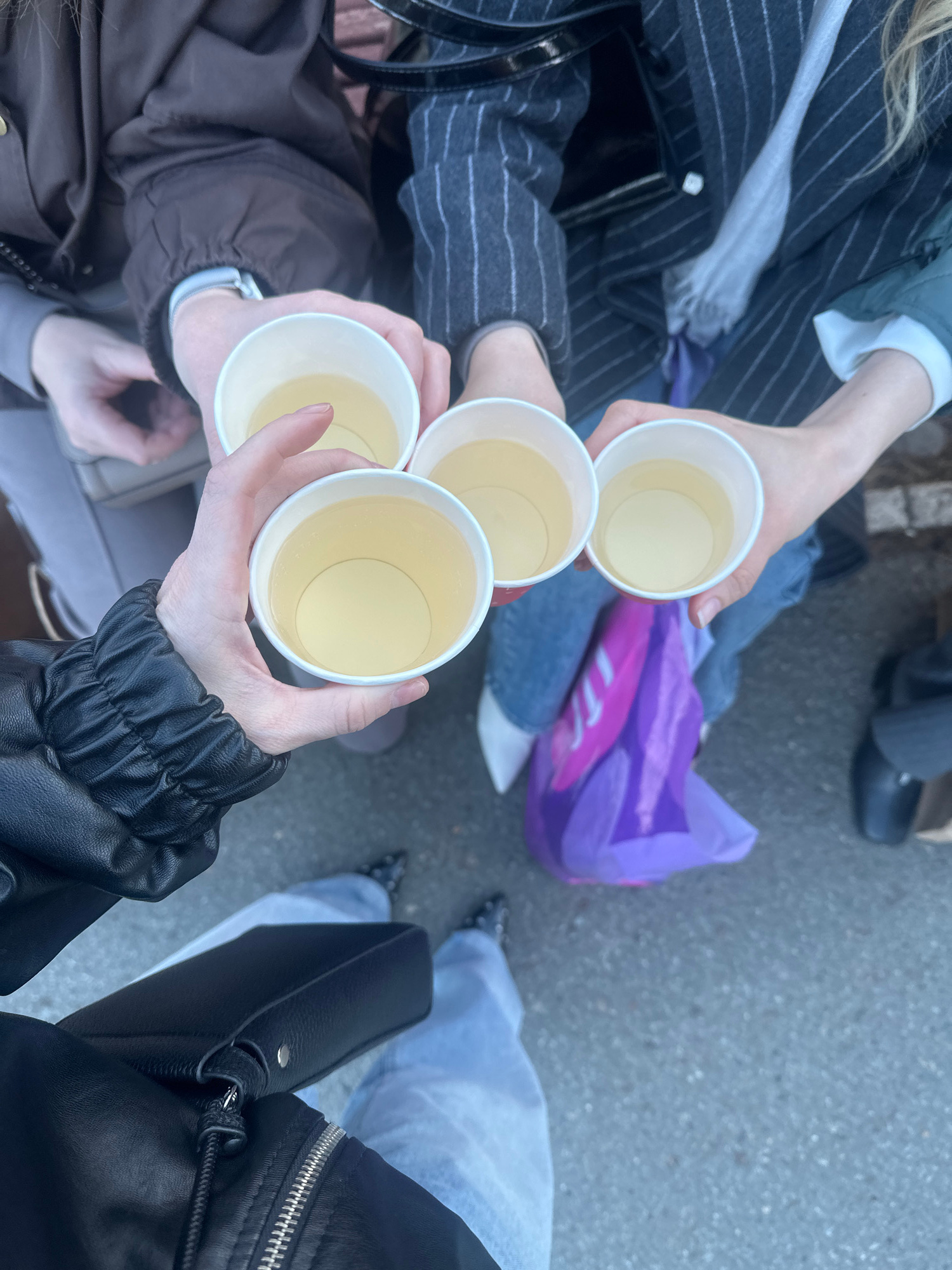 Four people are holding paper cups filled with a light-colored liquid, likely tea or juice, in what appears to be a celebratory toast. They are standing outdoors on a paved surface, presumably a stree…read more