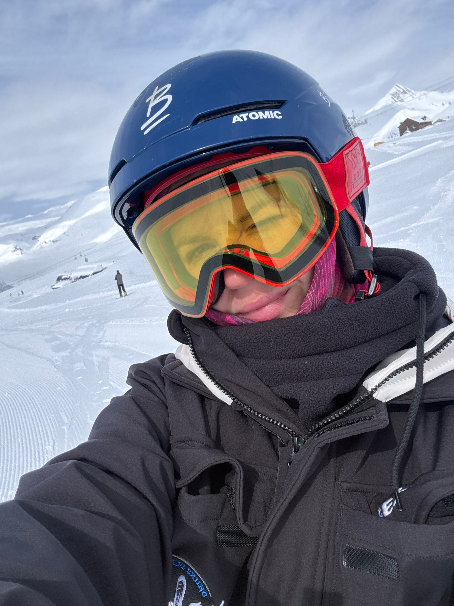The image is a downward-facing selfie taken on a ski slope. The subject is wearing a blue "Atomic" ski helmet with red goggle straps and yellow-tinted ski goggles. They are bundled in a black hooded jā¦read more