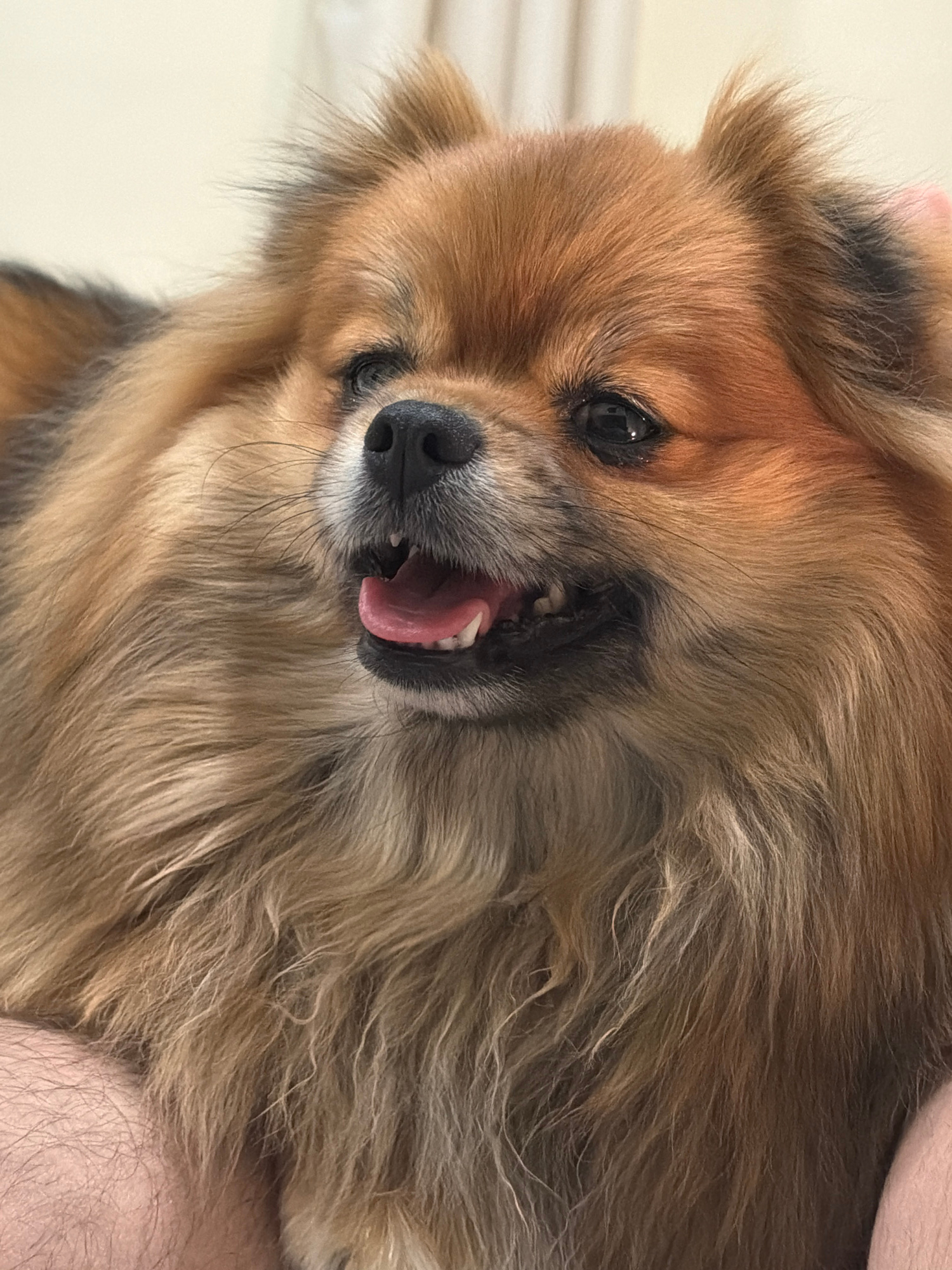 A close-up, tilted shot captures a medium-sized, long-haired dog with a mixed brown and tan coat. The dog's head is angled, exposing its open mouth and pink tongue. The dog's nose is black, and its ey…read more
