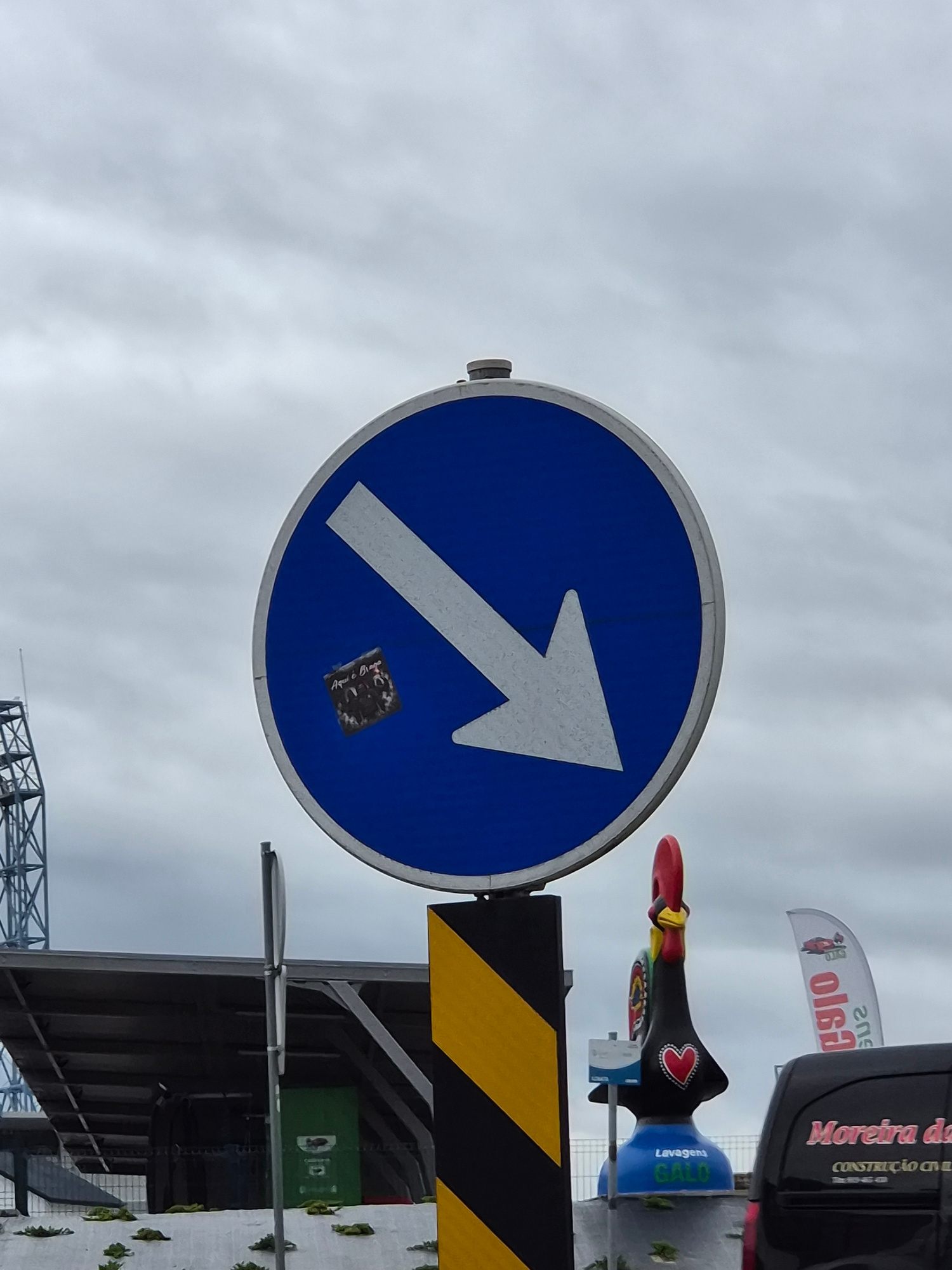 The image depicts a blue and white road sign with an arrow pointing diagonally upwards and to the right. The sign has a sticker on it and is located on a pole with yellow and black striped markings. A…read more
