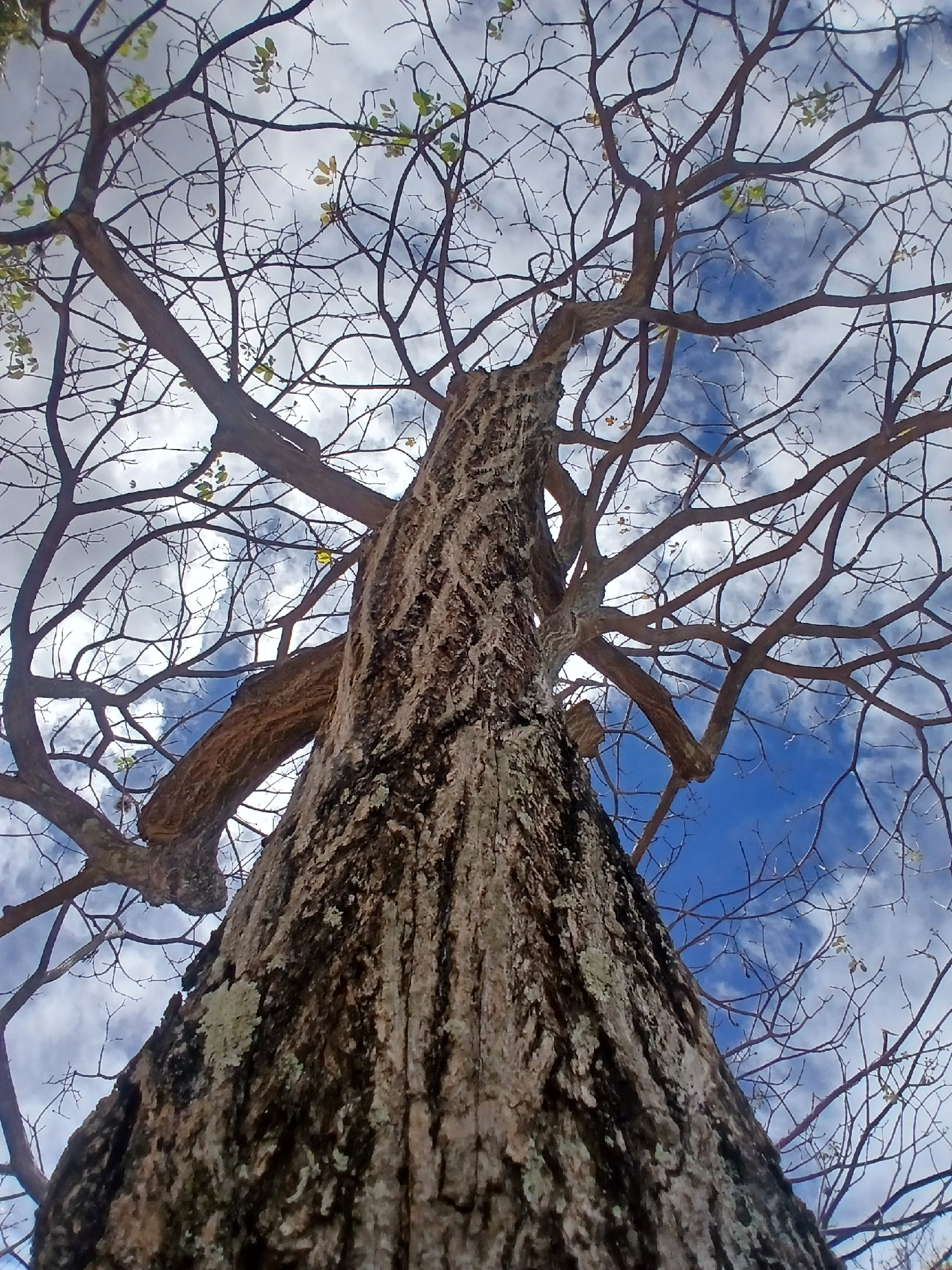 The image is taken from a low-angle perspective, looking up into a tree with mostly bare branches against a sky with scattered clouds. The trunk of the tree is prominently featured in the foreground,…read more