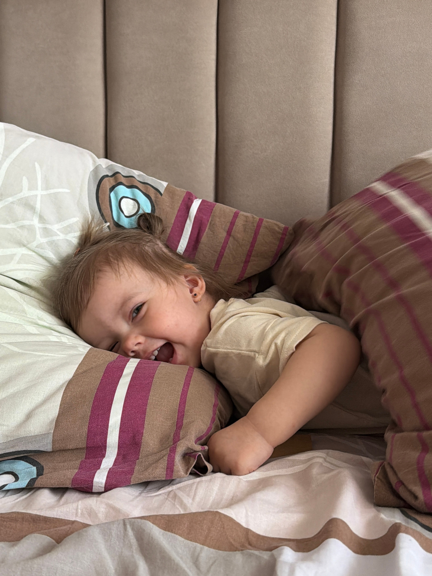 A child is lying on a bed with a pillow and duvet. The child is positioned upside down with their head near the bottom of the frame. The bedding has a striped pattern with brown, white, and pink lines…read more