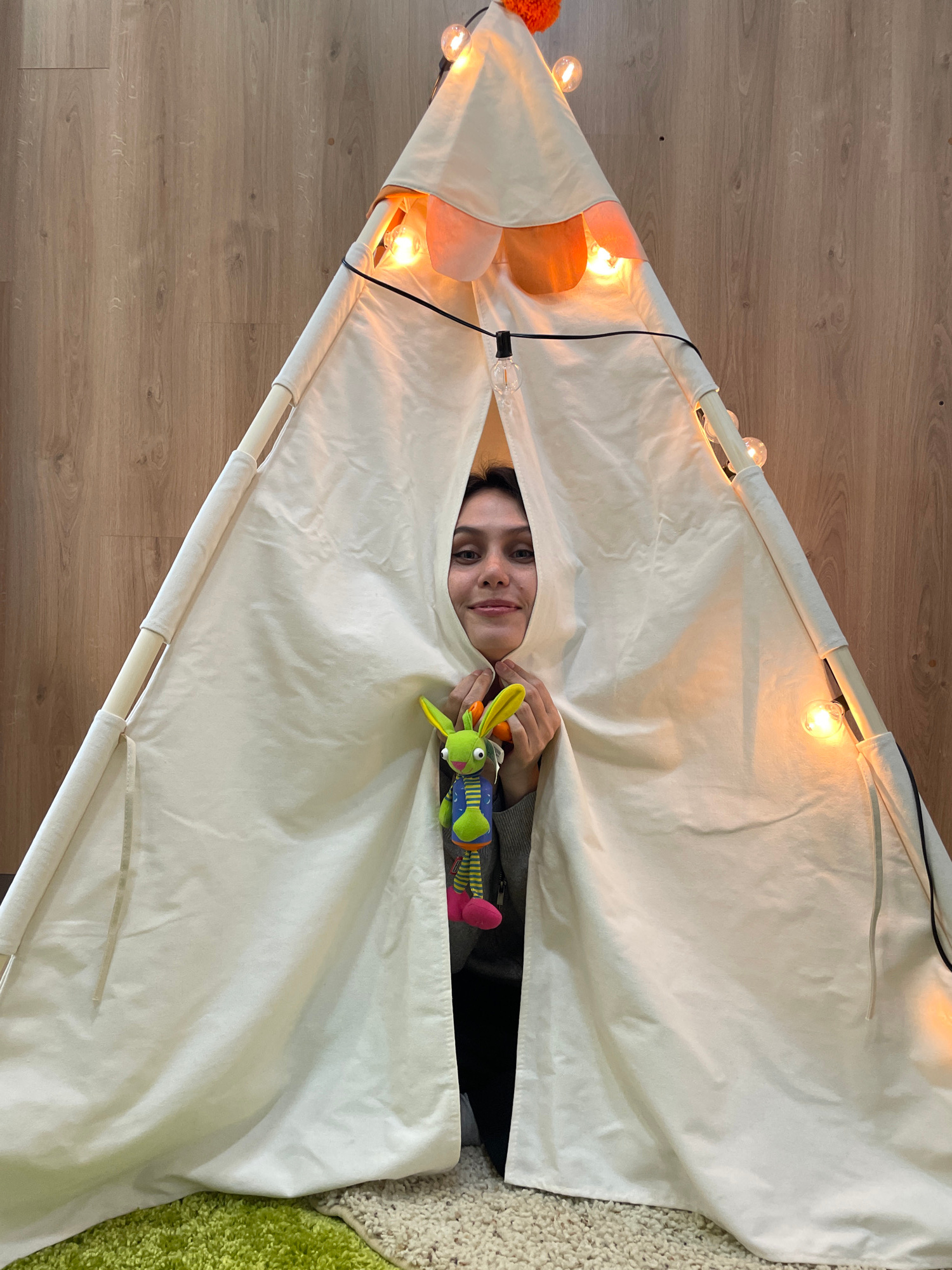 A woman lies inside a teepee tent, holding a toy. The teepee is lit with string lights. The flooring on the left is wood-patterned. On the right, there is a textured rug. The location is not specified…read more