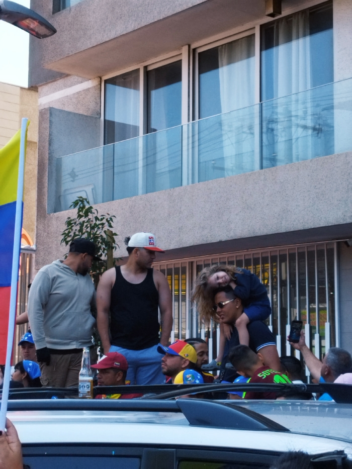 The image depicts an urban outdoor scene in Santiago, Chile, capturing a public gathering or procession during daylight hours. A modern, multi-story building with a light-colored facade, featuring lar…read more