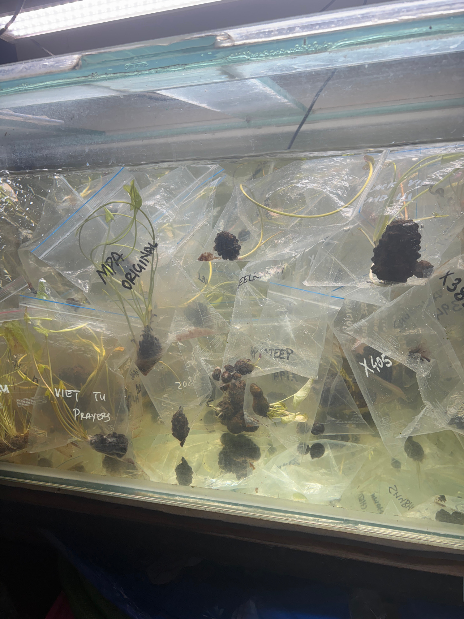 A close-up, high-angle shot depicts a glass aquarium filled with numerous small, clear plastic zip-lock bags containing aquatic plants and dark, irregularly shaped objects, possibly plant roots or sma…read more