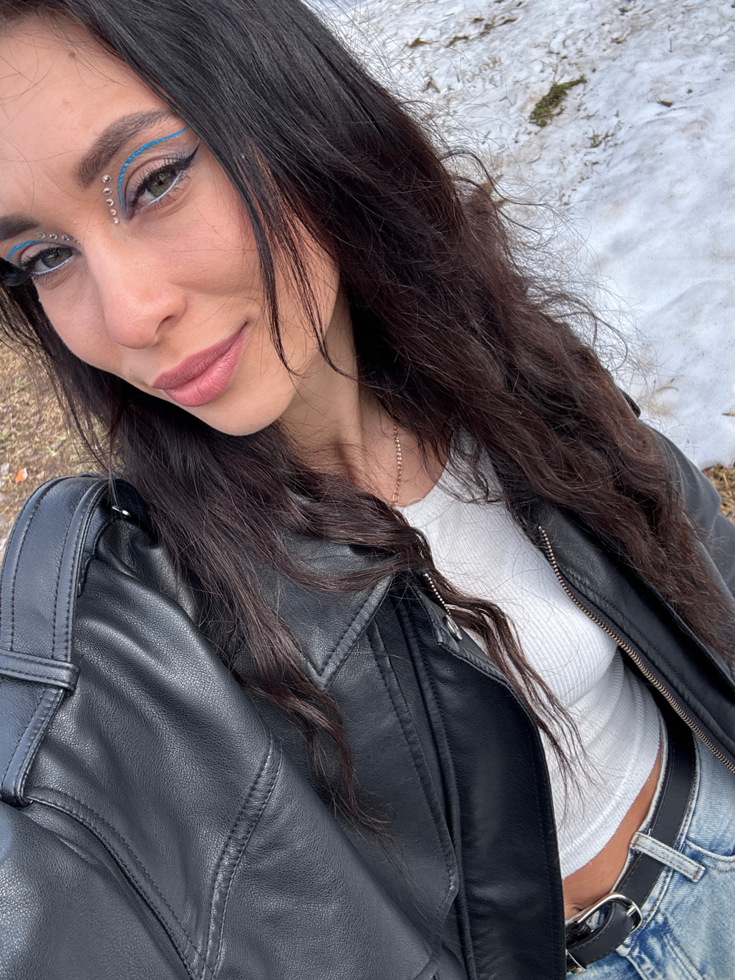 A woman lies on her side outdoors in what appears to be a snowy, grassy area. She has long, dark hair and is wearing blue eyeliner with decorative jewels under her eyes. She is also wearing a white to…read more