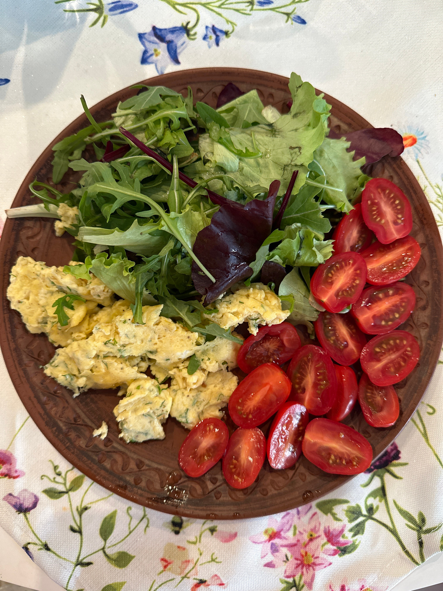 A top-down shot depicts a brown, patterned ceramic plate arranged with food on a floral-patterned tablecloth. The food includes a mix of salad greens, sliced cherry tomatoes, and scrambled eggs. The s…read more