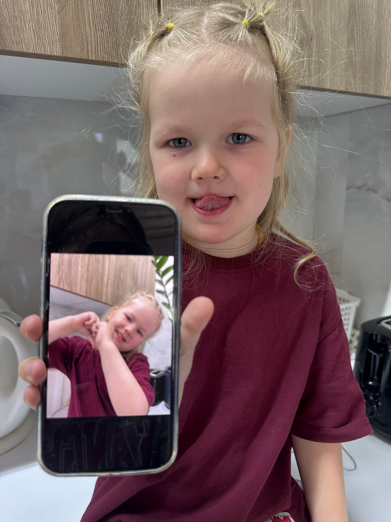A young blonde girl with her hair tied in pigtails is holding up a smartphone that displays a photo of herself smiling and posing with crossed arms. She is wearing a maroon t-shirt and sticking her to…read more
