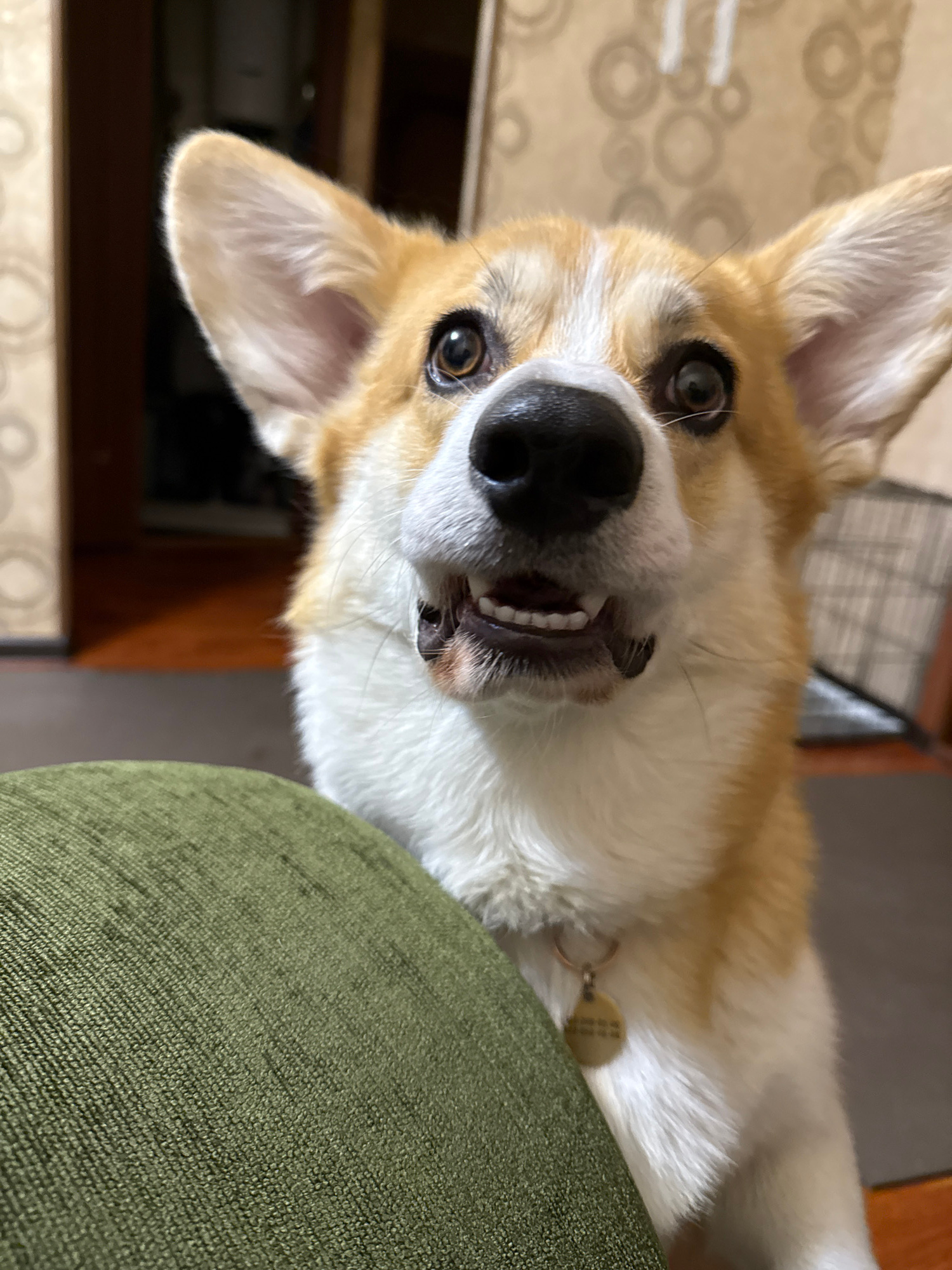 A tan and white Pembroke Welsh Corgi is lying on a green upholstered surface. The dog's head is tilted toward the viewer, showing its teeth. It has a black nose, dark eyes, and a collar with a tag. Th…read more
