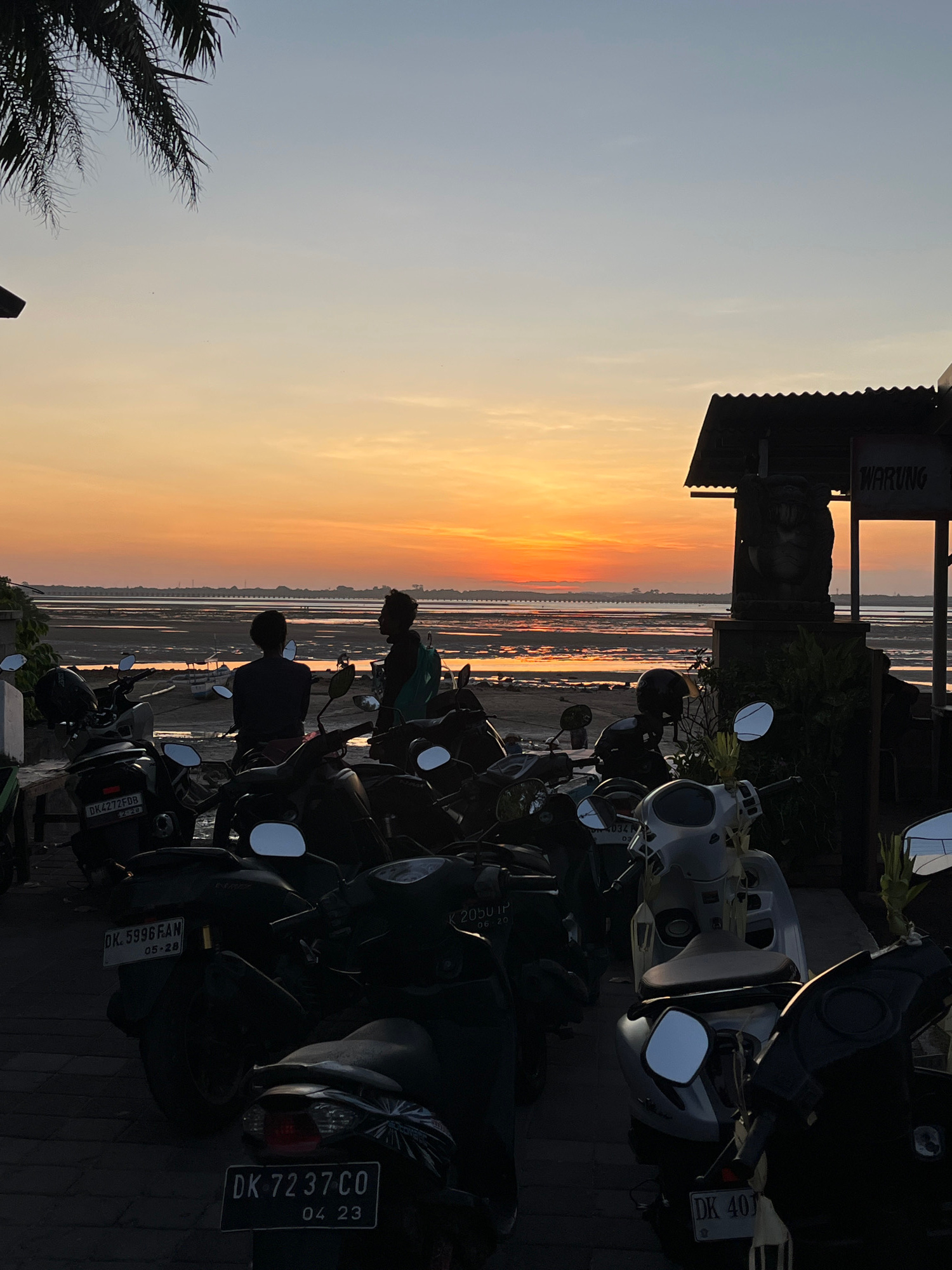 Captured at dusk or dawn in Kuta Selatan, Indonesia, the image shows a row of parked motorbikes, with license plates visible: DK4272FDB, DK. 5996 FAN, K 2050 IP, DK 7237 CO, and DK 40. Two people are…read more