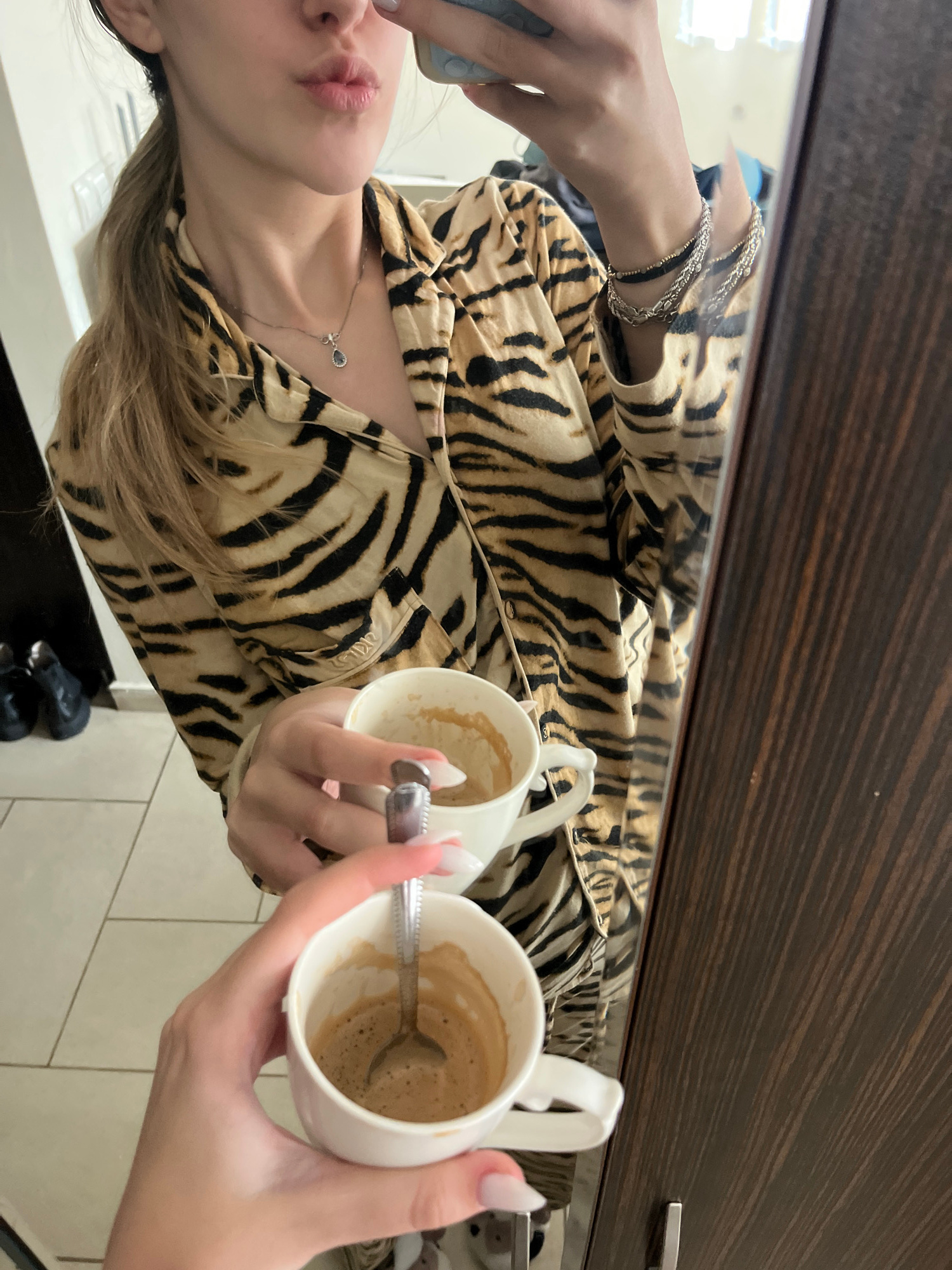 The image is a selfie of a young woman with long blonde hair, light skin, and pink lips, wearing a tiger-striped shirt, taken in a mirror. She is holding two white ceramic coffee cups, one in each han…read more