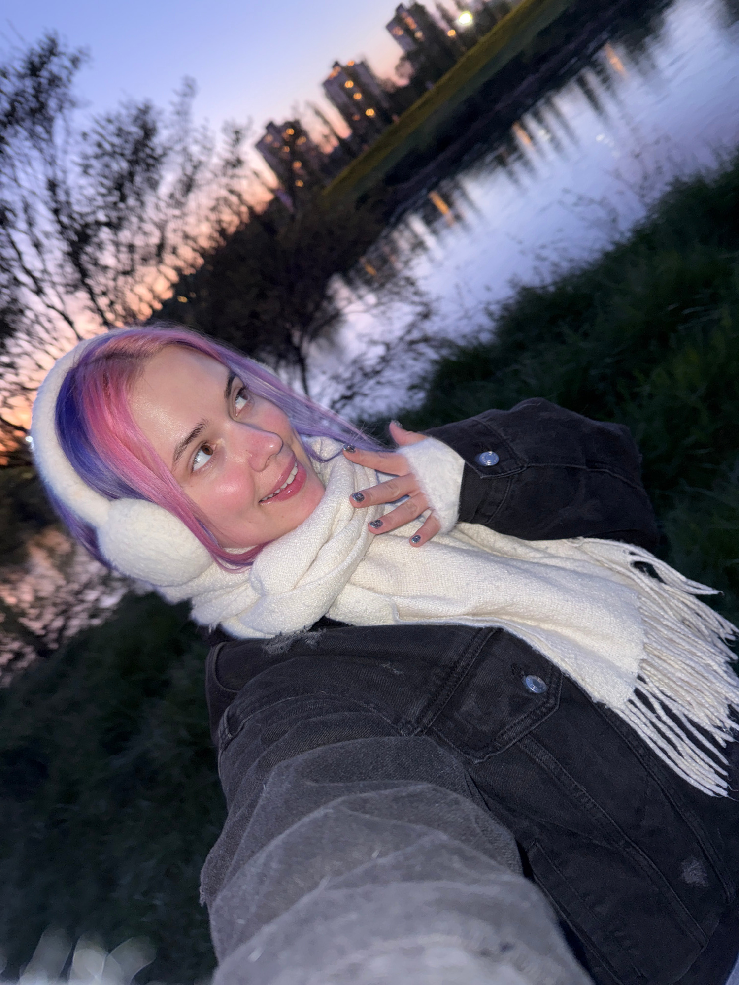 A woman wearing earmuffs and a scarf is the focus of the photograph. The background features a body of water reflecting city lights and bare trees. The location is in the City of Zagreb, Croatia.