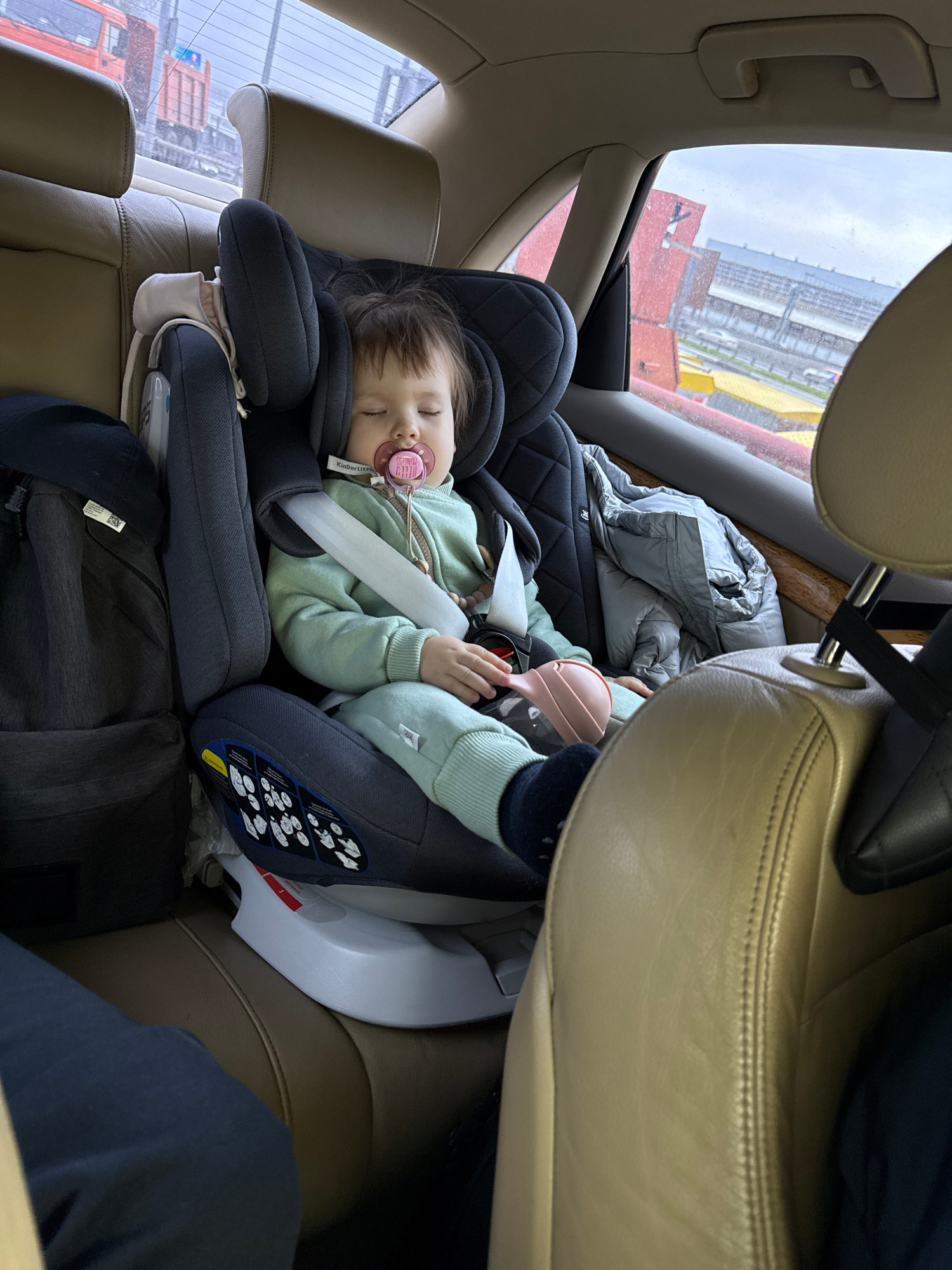 A young child sleeps in a car seat. The child is wearing a light green sweatshirt and has a pacifier in their mouth. The car seat is in the back of a car with beige leather interior. The car is in Mos…read more