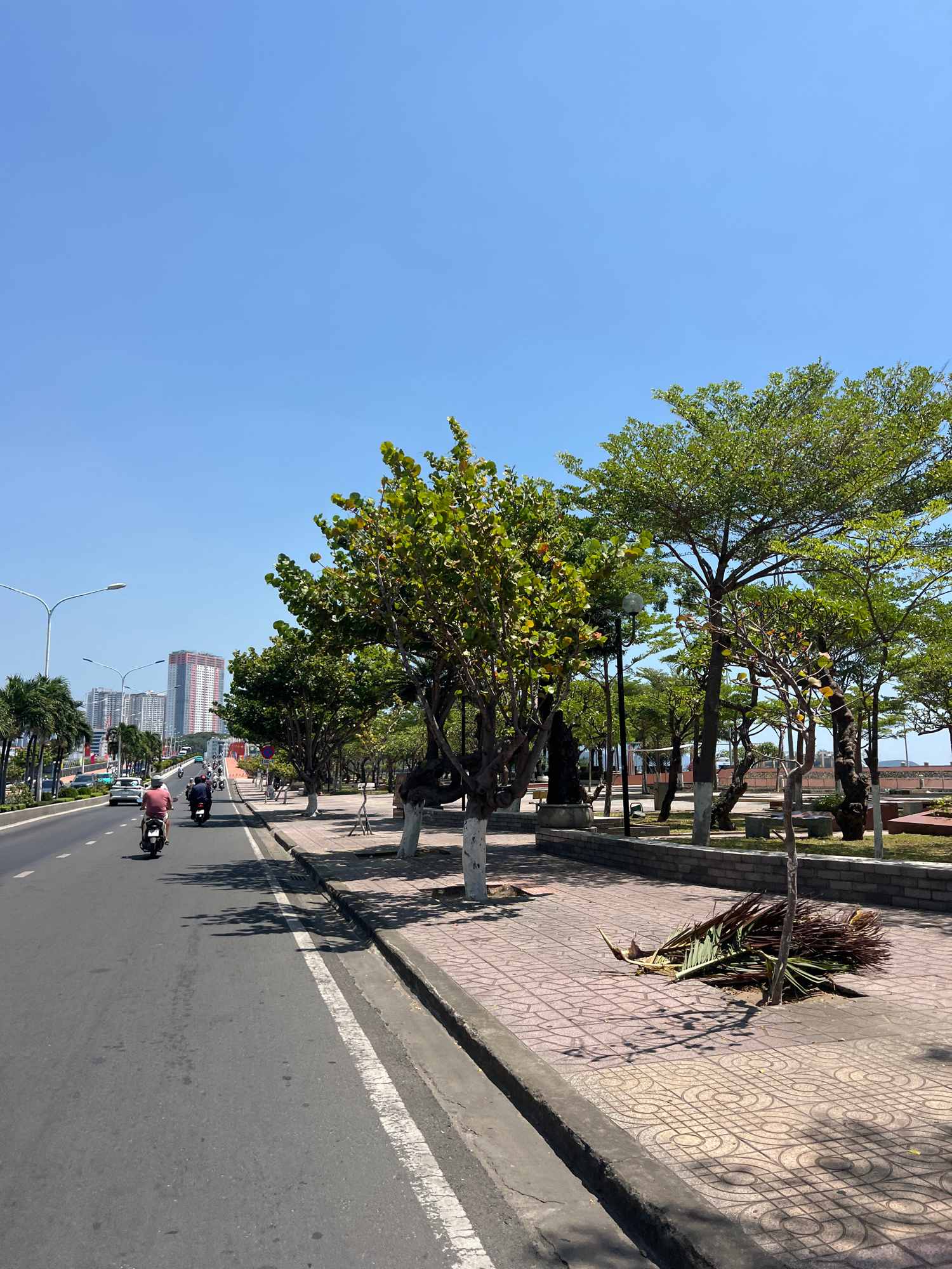 The photograph depicts a street scene in Nha Trang, Vietnam. The viewpoint is from the side of a wide street lined with trees, looking down its length. The sky is clear and blue. On the right side of…read more
