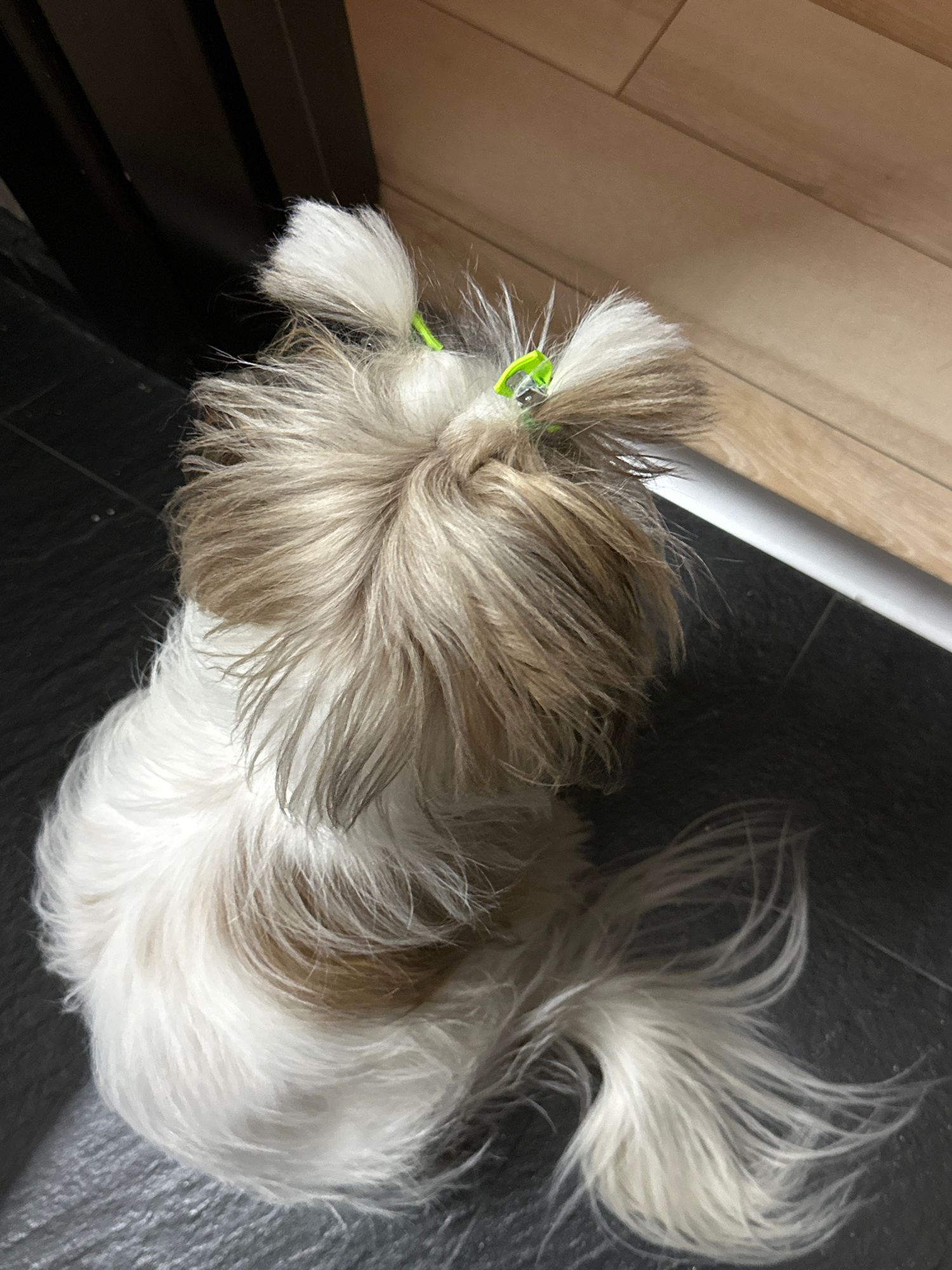 A long-haired, small dog with white and light brown fur is lying on a dark, tiled floor. The dog has a green clip in its hair near its head. To the left of the dog is a wooden surface and a white cyli…read more