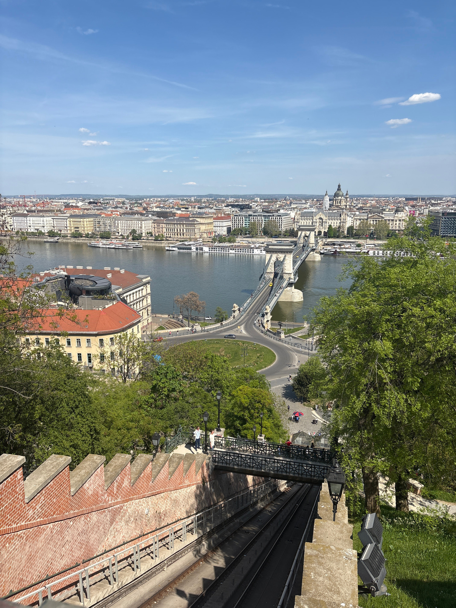 View from Buda Castle, Budapest, Hungary. The image shows a panorama of the city with the Danube River cutting through. The Chain Bridge is visible, and urban buildings stretch along the riverbanks. T…read more