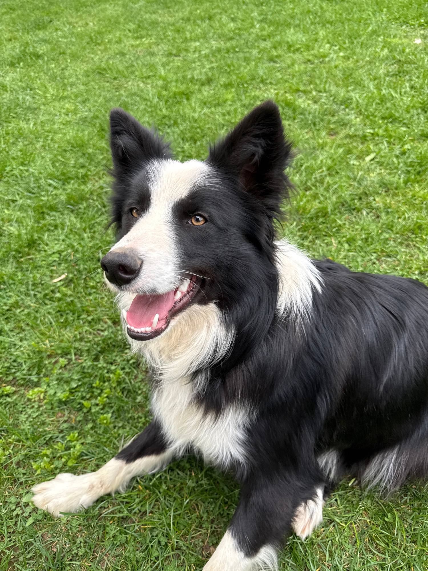 A black and white Border Collie lies on a lawn of green grass. The dog is panting with its mouth open, revealing its pink tongue and white teeth. The dog's eyes are brown. The background shows grass without any visible buildings or structures. The location, Berkovitsa, Bulgaria, cannot be verified from the image. | Open Wire