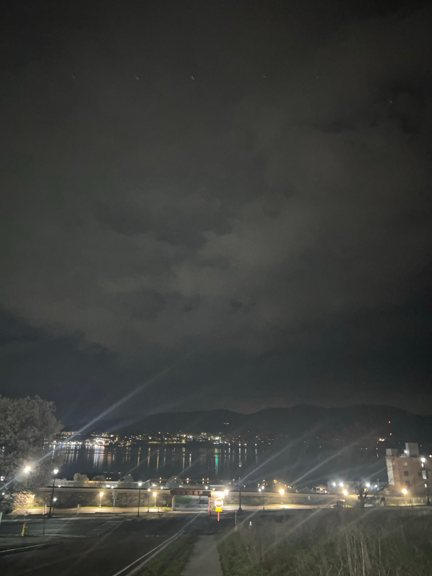 The image shows a night view of the City of Newburgh, United States of America, along the Hudson River. A dark, overcast sky hangs over the river, with reflections of city lights visible on the water'…read more