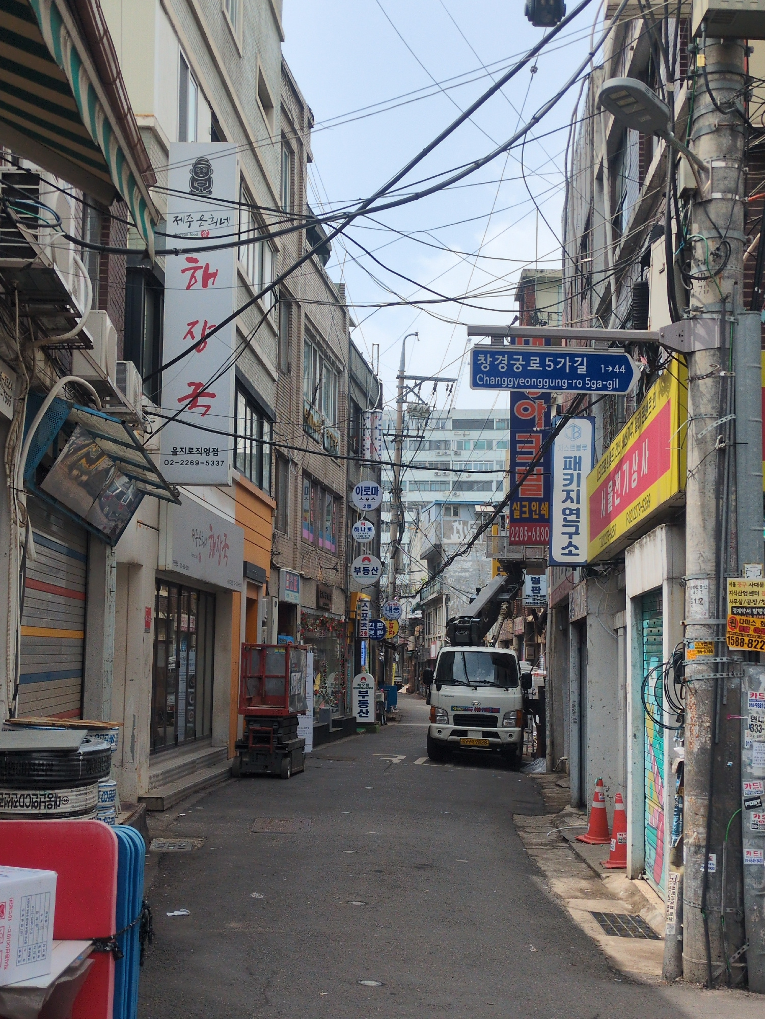 The image captures a narrow alleyway in Seoul, South Korea, bustling with activity and densely packed infrastructure. The street is lined with multi-story buildings, their facades cluttered with signs…read more
