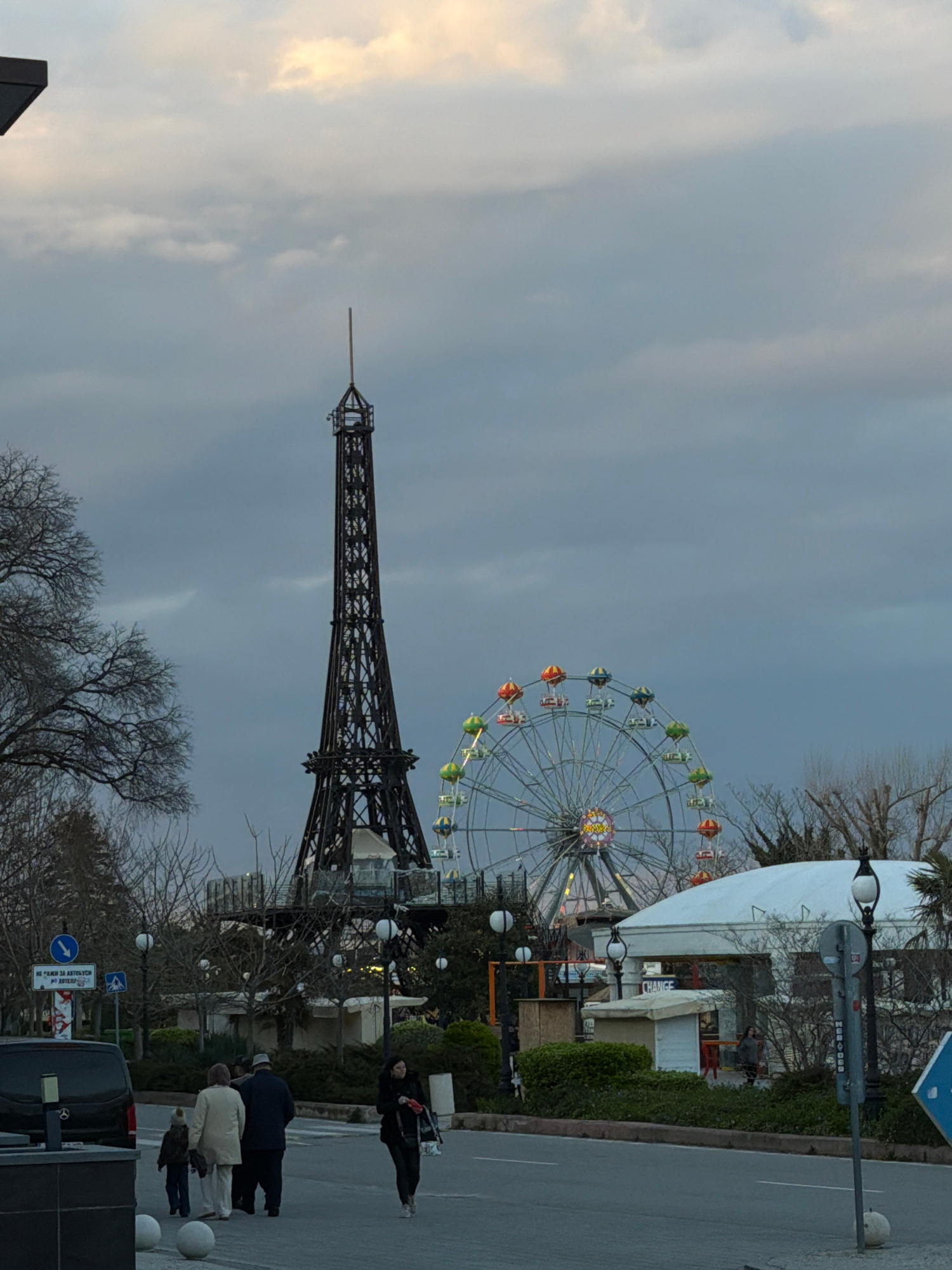 The image depicts a miniature Eiffel Tower and a Ferris wheel in Varna, Bulgaria. The sky is overcast. Several pedestrians are walking on the paved area adjacent to a street. Cars are parked nearby. S…read more