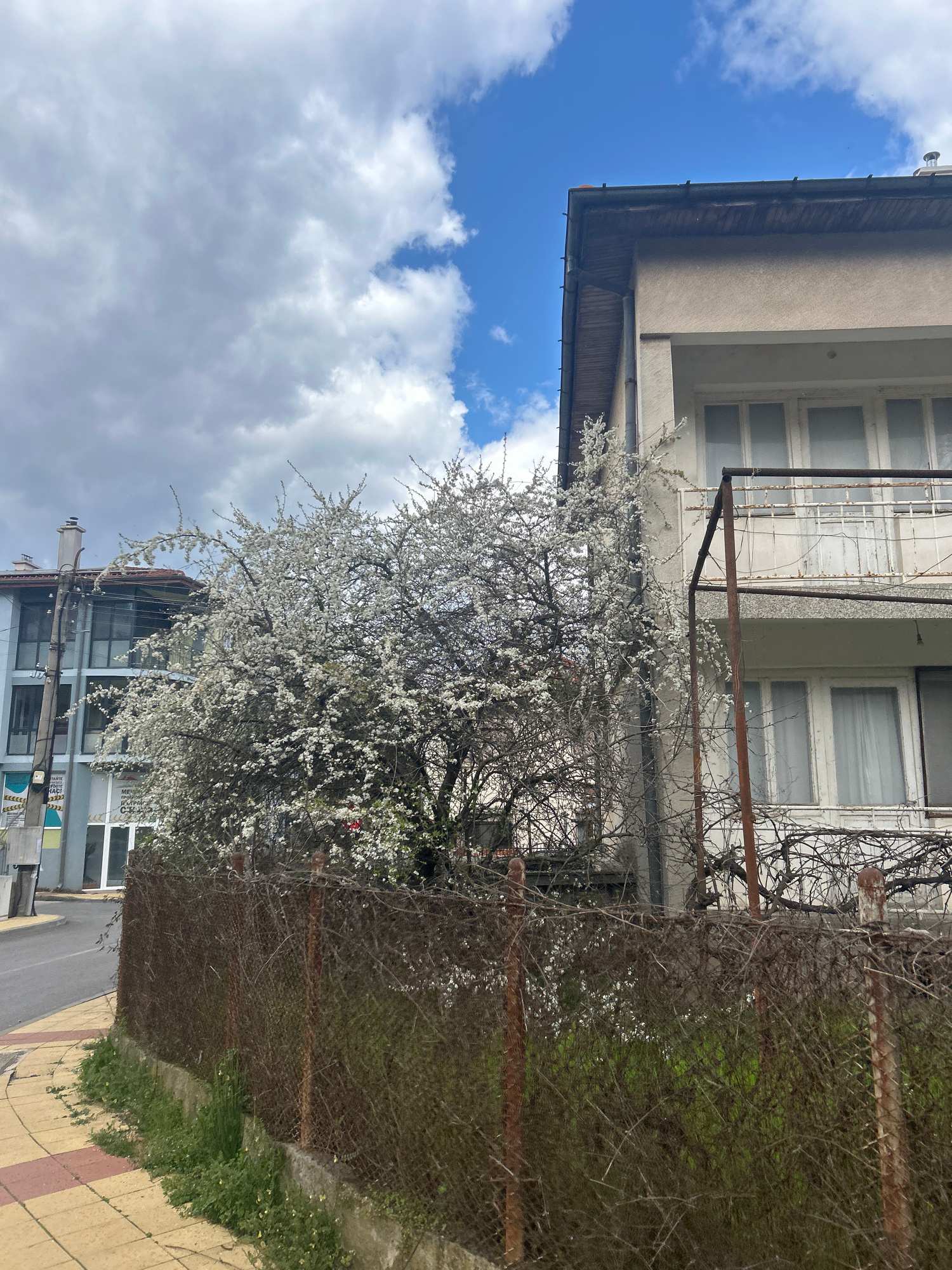 The image captures an outdoor scene in Zlatograd, Bulgaria, featuring a flowering tree with white blossoms as the central subject. The tree is located near a multi-story building with white-framed win…read more