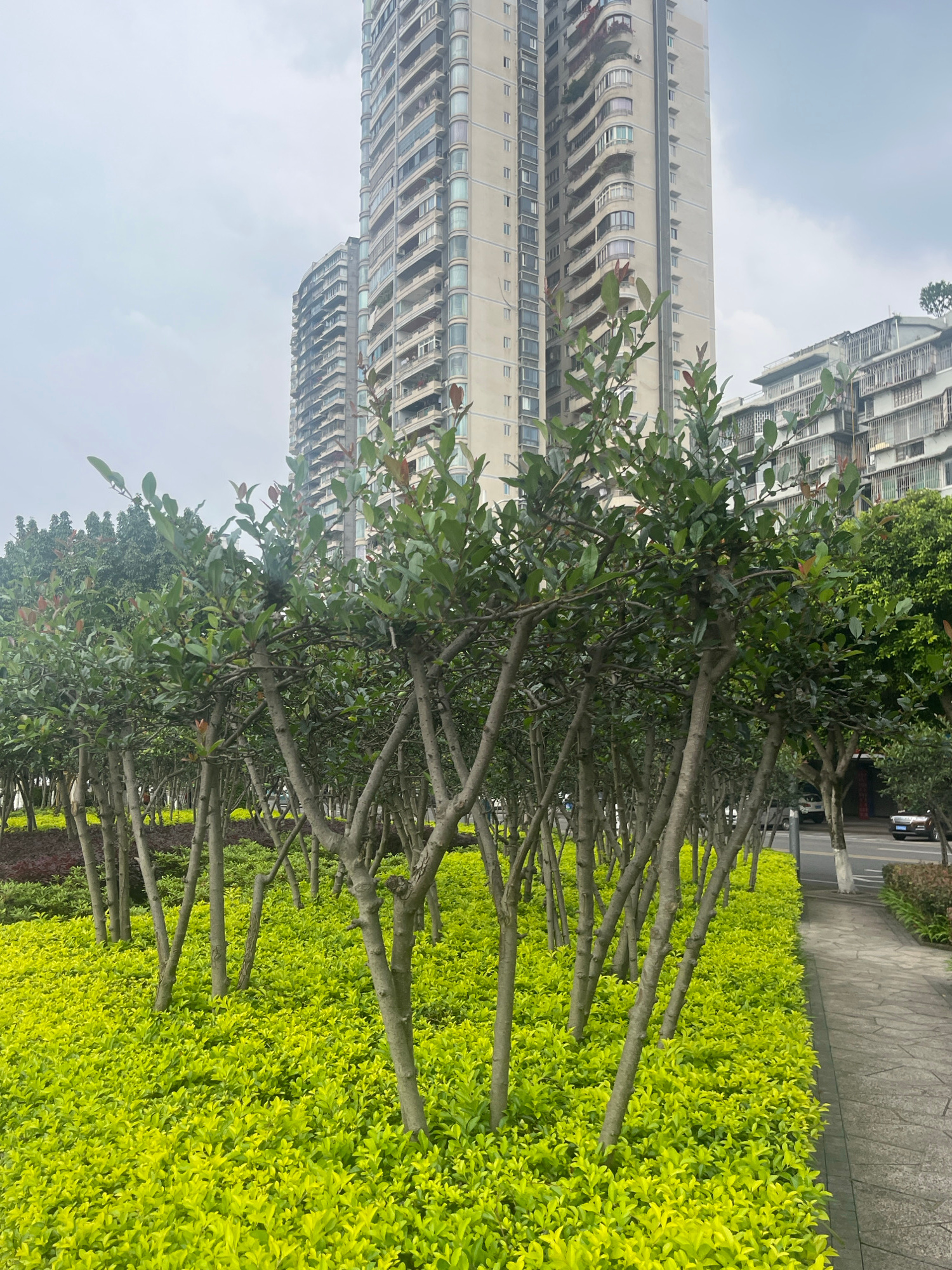 The image depicts an urban scene in Jiangjin, China, featuring a row of trees and hedges along a sidewalk with tall residential buildings in the background. The trees have green leaves and visible tru…read more