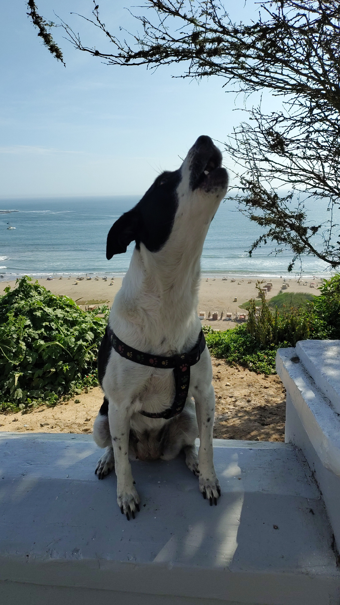 A dog with black and white fur lies on a gray, concrete ledge at the beach in the city of Chorrillos, Peru. The dog is looking up and appears to be howling. It wears a black harness decorated with paw…read more