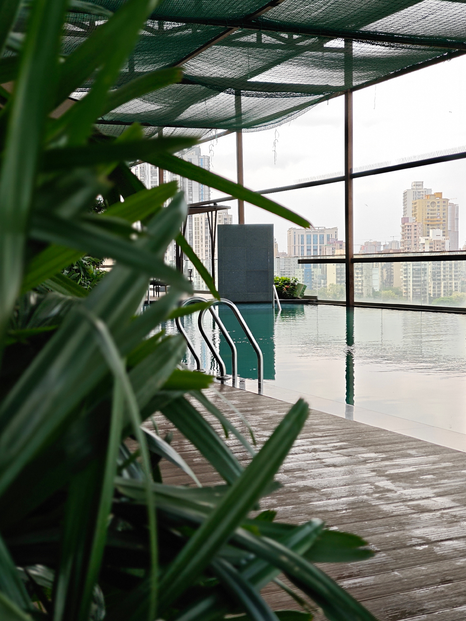 The image shows an infinity pool in Mumbai, India. The pool is on a rooftop, with a green mesh roof structure above. The pool's water reflects the surrounding cityscape, visible through large glass paβ¦read more