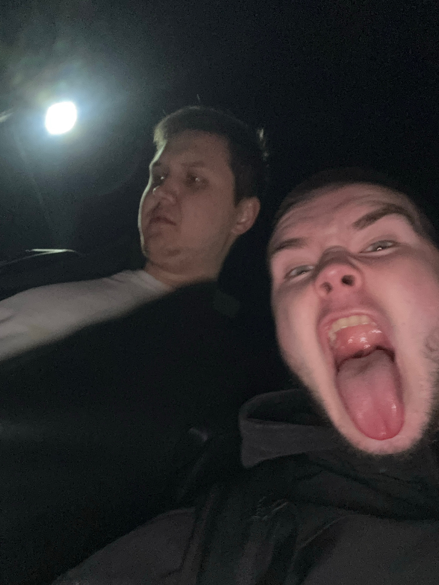 The media file features two young males in a dimly lit, dark setting, likely at night, with a prominent artificial light source visible in the lower-left background. The image is composed from a low-a…read more