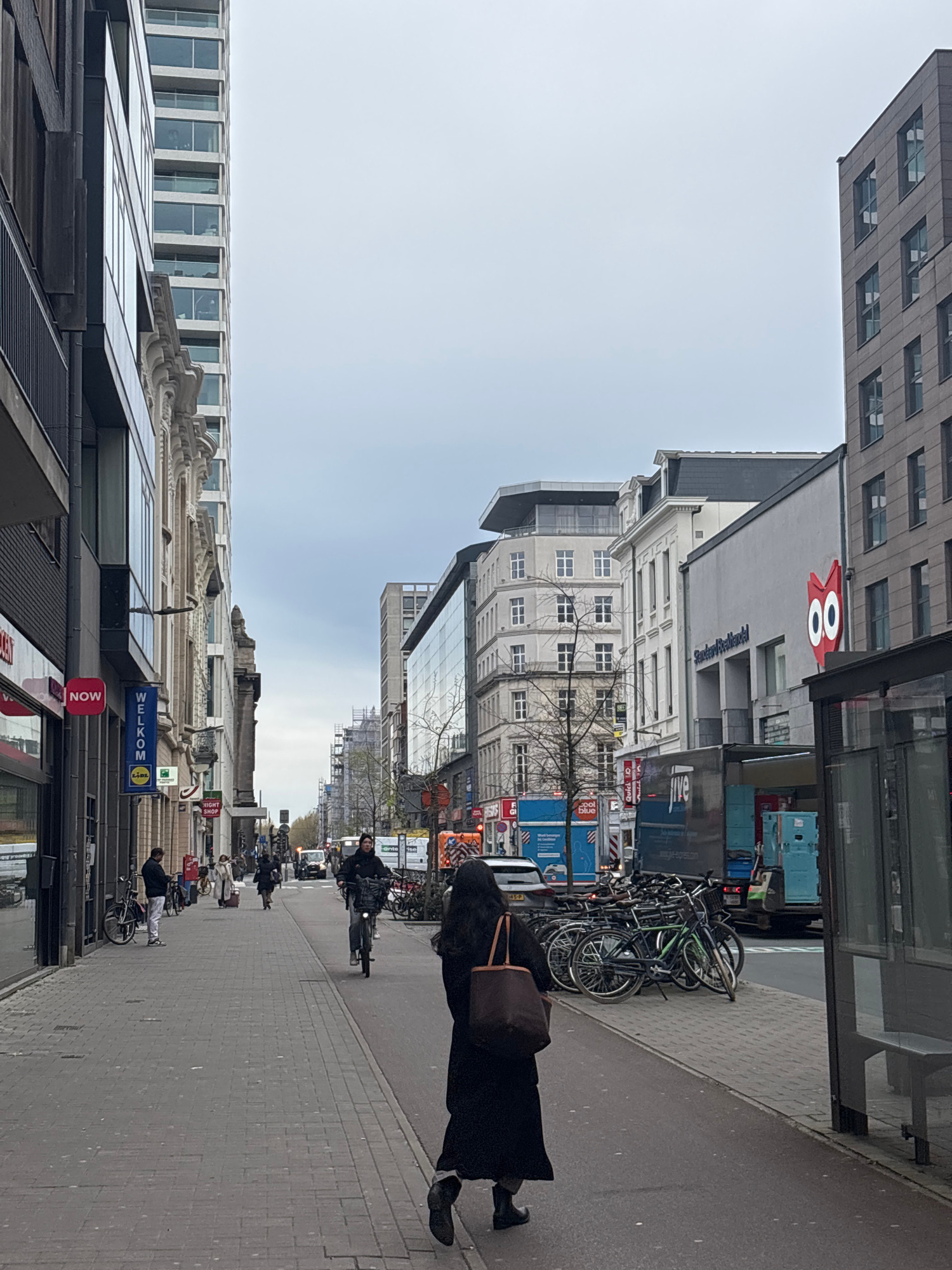 Here's a detailed description of the image: **Overall Scene:** The image shows a street scene in Antwerp, Belgium, characterized by a mix of architectural styles, urban infrastructure, and pedestria…read more