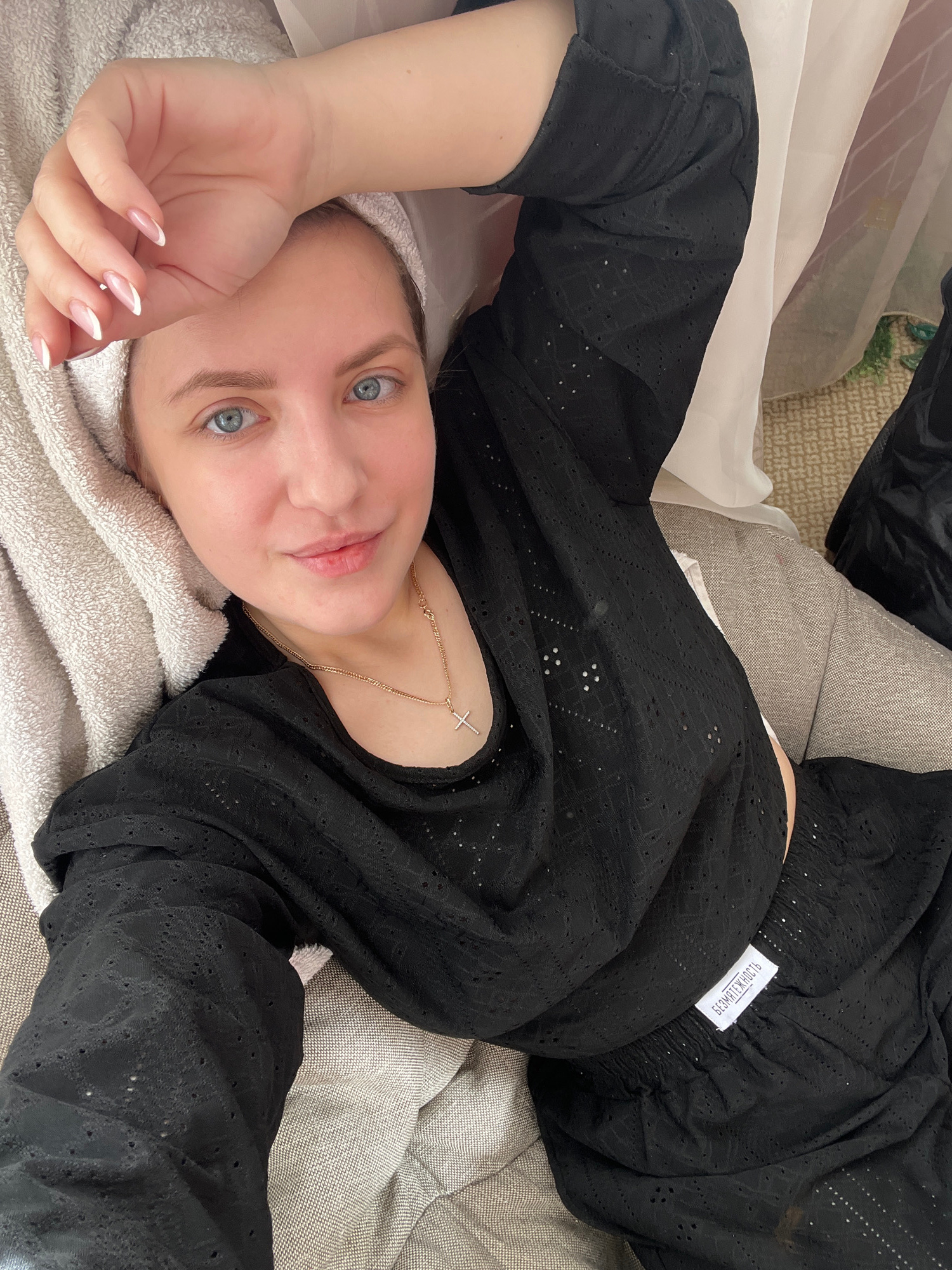 A young woman is lying down, likely indoors. She has fair skin, blue eyes, and light brown hair. She is wearing a black, eyelet-style top, and a gold necklace with a cross pendant is visible. Her nail…read more