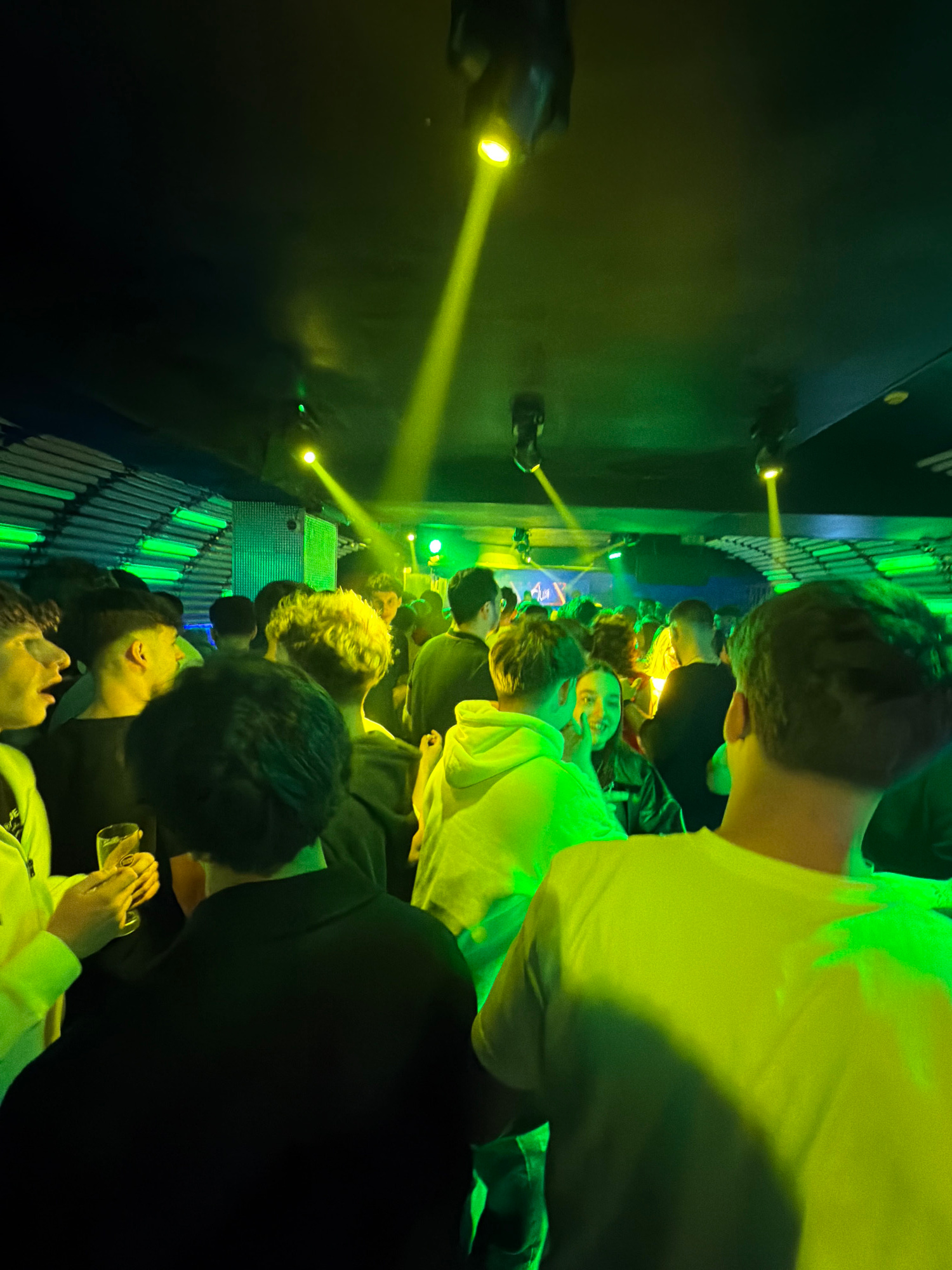 The image shows a crowded indoor event, possibly a concert or club, likely in Vila Real, Portugal. People are standing close together, illuminated by green and yellow stage lighting. Some individuals…read more