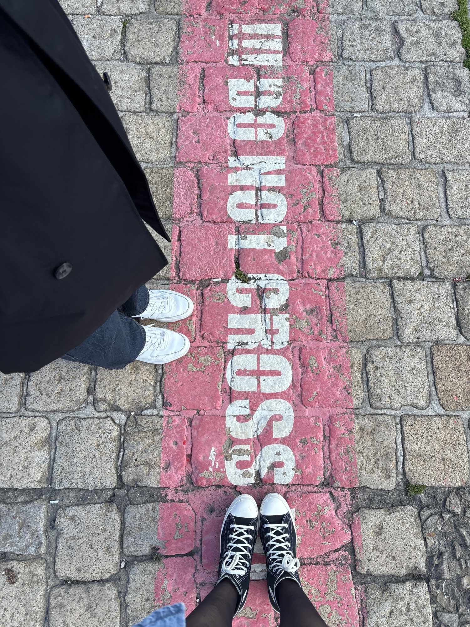 A street scene photographed from above shows a cobblestone surface with a red painted stripe and the words "DO NOT CROSS" in white. Three sets of legs and feet are visible. One person wears white snea…read more