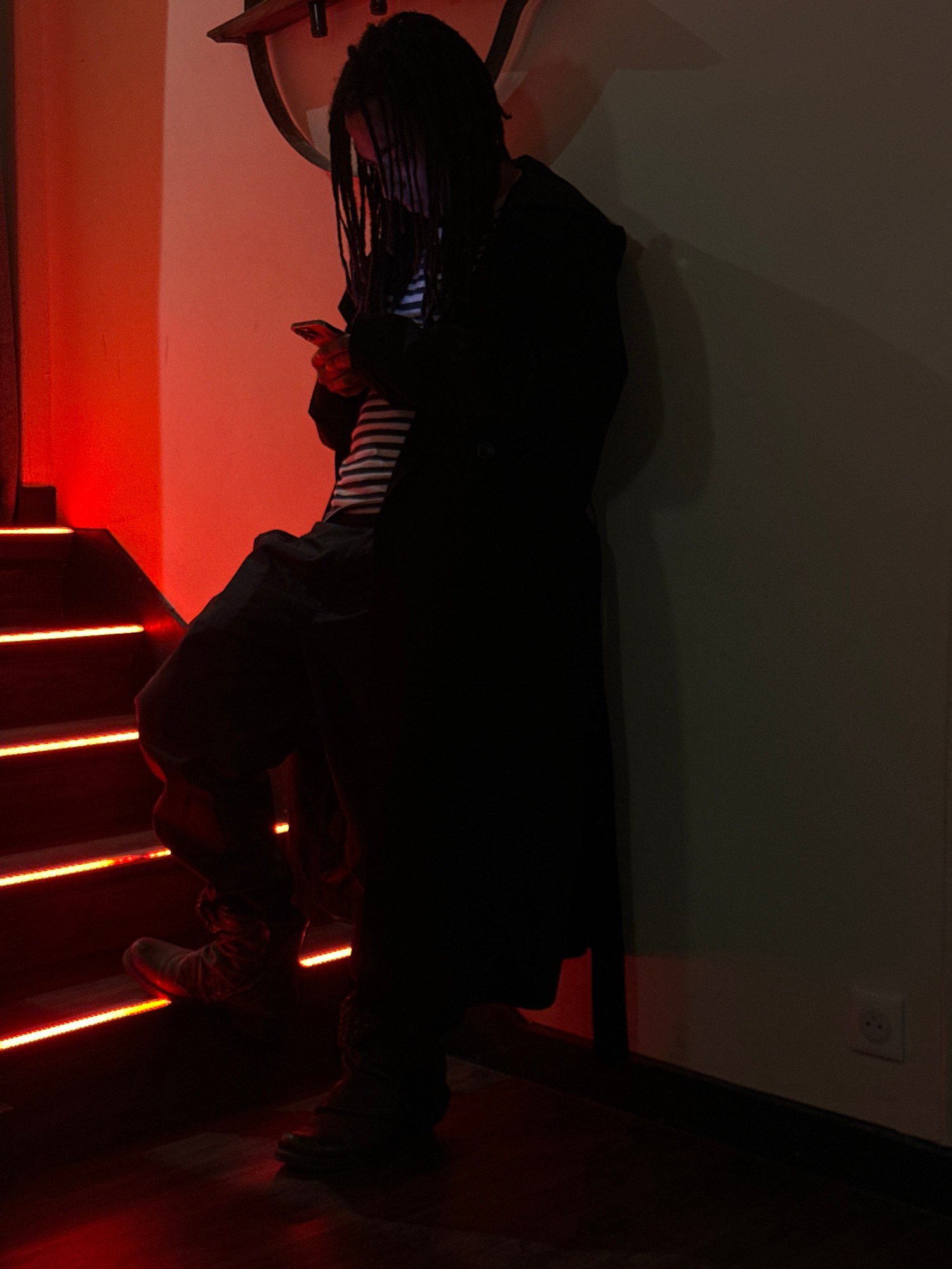 A person is on a dimly lit staircase with red light bars on the sides. The person is wearing a dark jacket, and a striped shirt, and appears to be looking at a mobile phone. The environment suggests a…read more