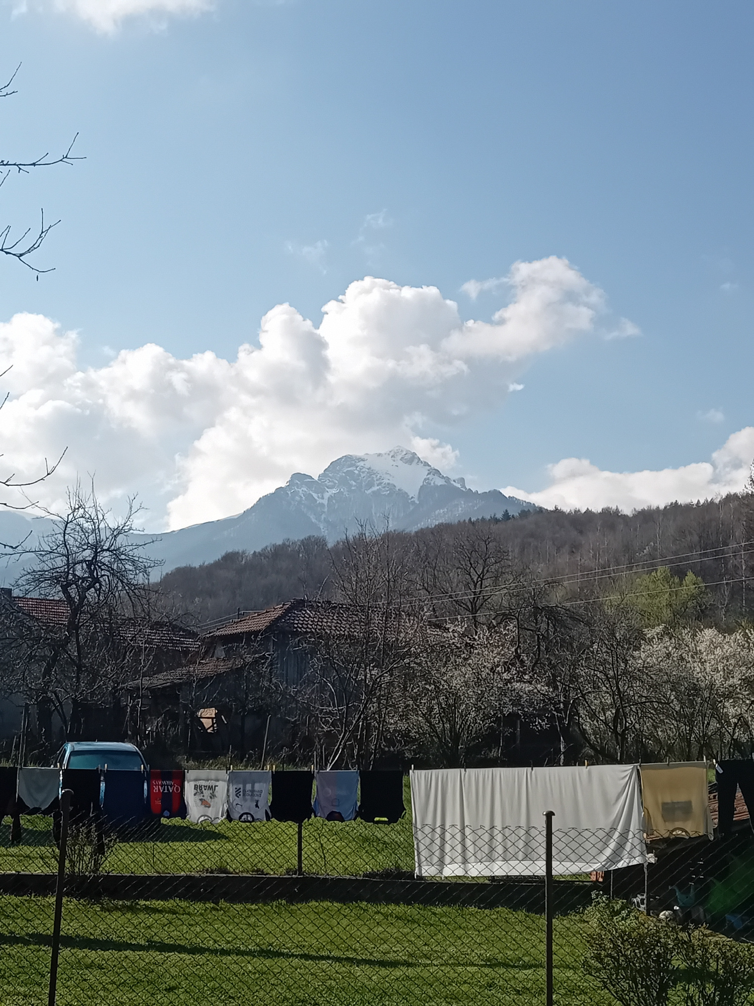 The image shows a landscape featuring a mountain with a partially snow-covered peak. A line of laundry hangs on a clothesline strung near a chain-link fence, with items of clothing displayed including…read more