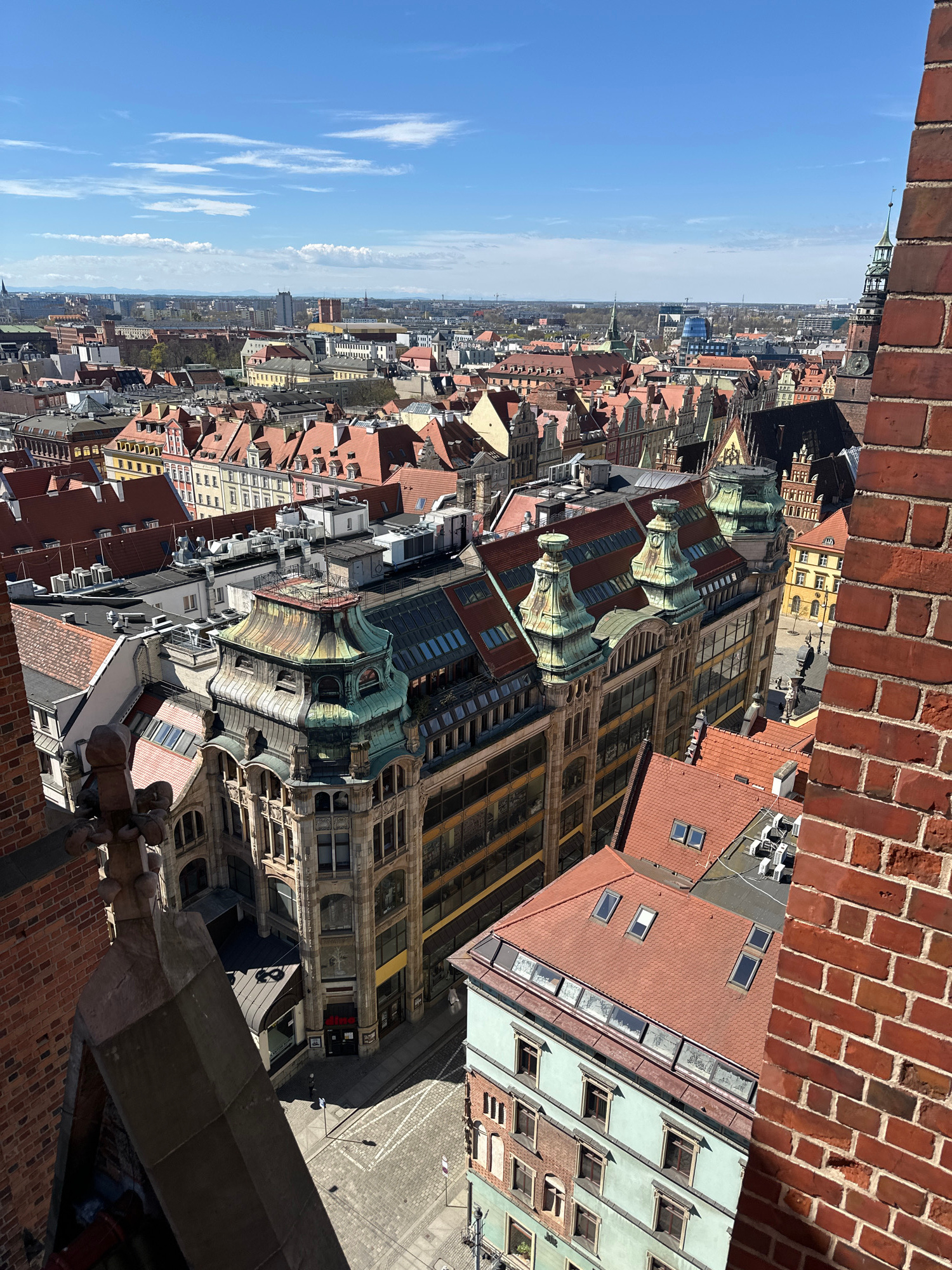 A high-angle shot captures a section of Wrocław, Poland, framed by the weathered brickwork of a building's edge. Dominating the foreground is the architectural detail of a building, possibly a cathedr…read more