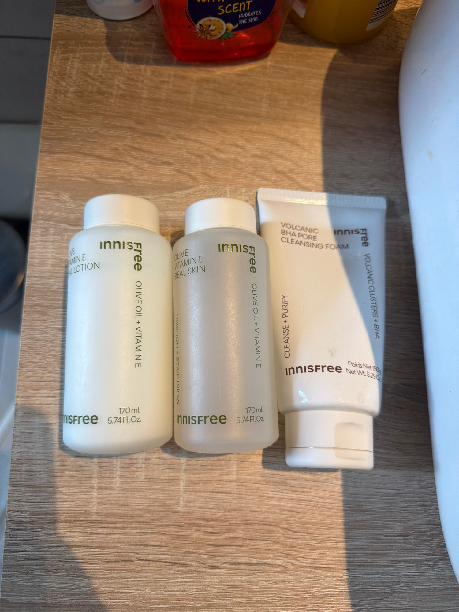 The image shows three white tubes/bottles of Innisfree skincare products lying on a wooden surface. The top product is "VOLCANIC BHA PORE CLEANSING FOAM", the middle one is "OLIVE OIL + VITAMIN E REAL…read more
